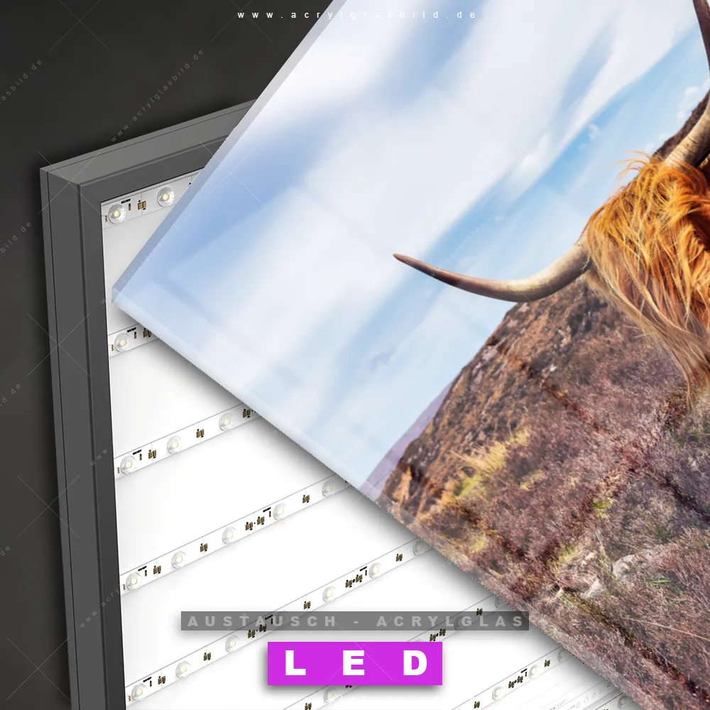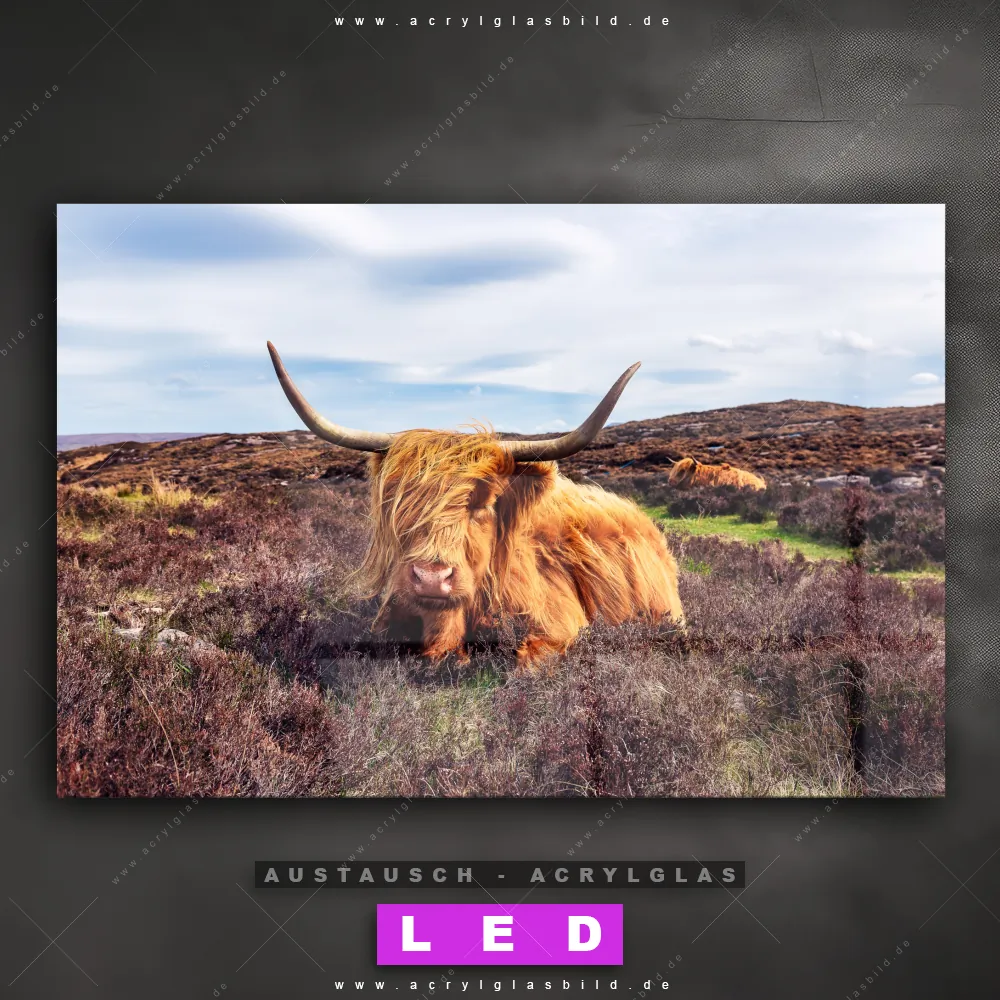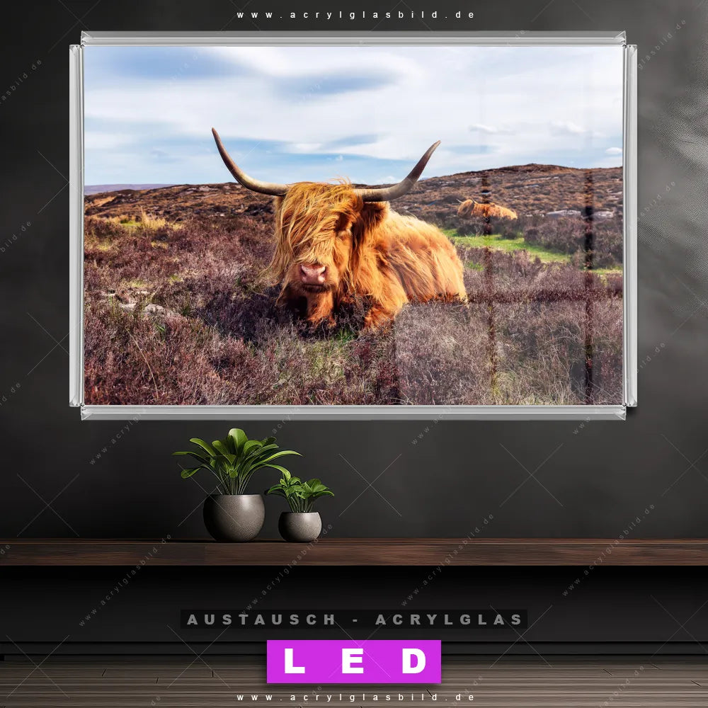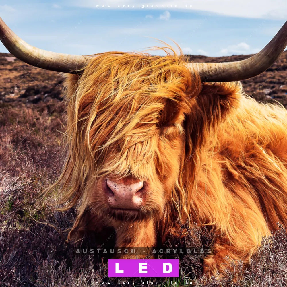 Begriffe wie Tier, Stier, Hochlandkuh, Highlander, Büffel, Rind, Bulle, Hochlandrind, Wiese, Weide, Hörner, Gras haben dich auf der Suche nach deinem neuen Austausch-Acrylglasbild inspiriert? Dann sollte das Wechsel-Acrylglasbild schottisches Hochlandrind auf Bergwiese für dein bereits vorhandenes LED Acrylglasbild Canvalight® DIA den Weg zu dir finden.