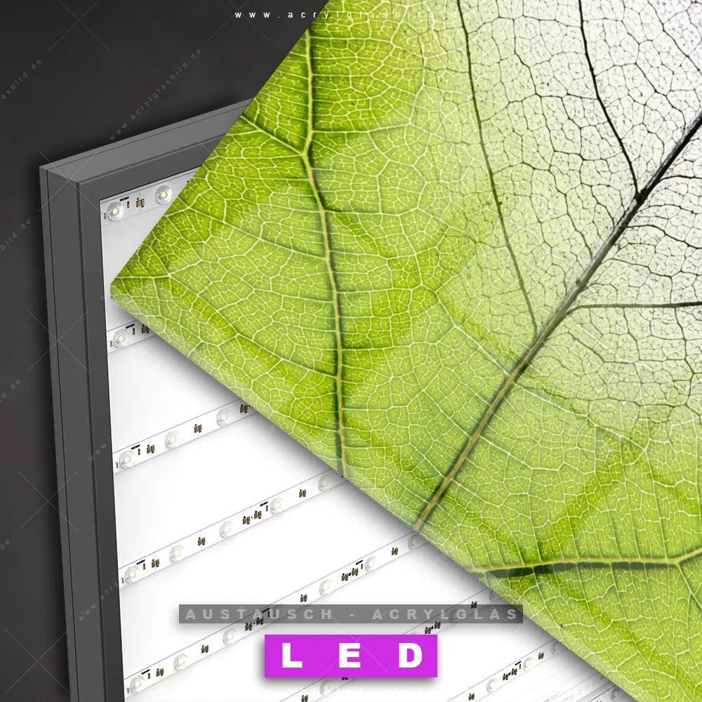 Begriffe wie Blätter, Pflanze, Natur, Nahaufnahme, Vogelperspektive, Draufsicht, Blatt, Makro, Close Up, Blattadern haben dich auf der Suche nach deinem neuen Austausch-Acrylglasbild inspiriert? Dann sollte das Wechsel-Acrylglasbild Laubblatt in weiß/grün für dein bereits vorhandenes LED Acrylglasbild Canvalight® DIA den Weg zu dir finden.