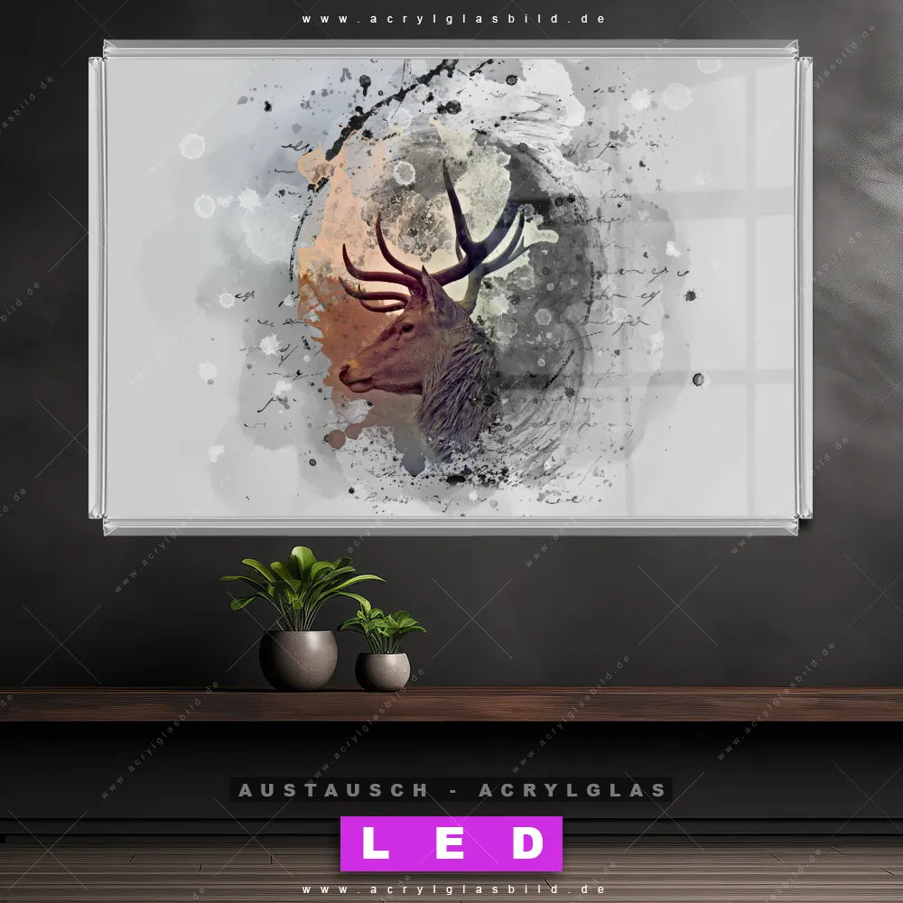 Begriffe wie Streetart, modern, Grunge, Hirsch, Reh, Geweih haben dich auf der Suche nach deinem neuen Austausch-Acrylglasbild inspiriert? Dann sollte das Wechsel-Acrylglasbild Modernes Wildlife-Artwork für dein bereits vorhandenes LED Acrylglasbild Canvalight® DIA den Weg zu dir finden.