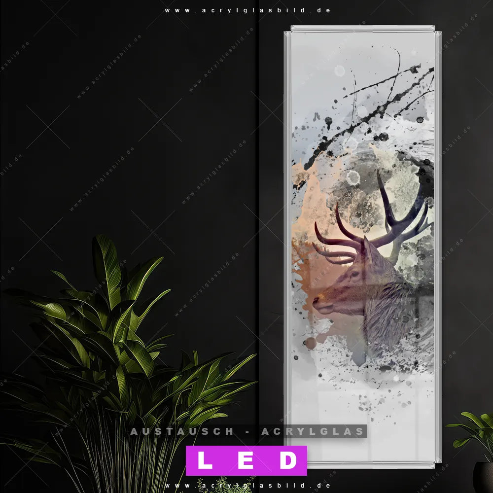Begriffe wie Streetart, modern, Grunge, Hirsch, Reh, Geweih haben dich auf der Suche nach deinem neuen Austausch-Acrylglasbild inspiriert? Dann sollte das Wechsel-Acrylglasbild Modernes Wildlife-Artwork für dein bereits vorhandenes LED Acrylglasbild Canvalight® DIA den Weg zu dir finden.