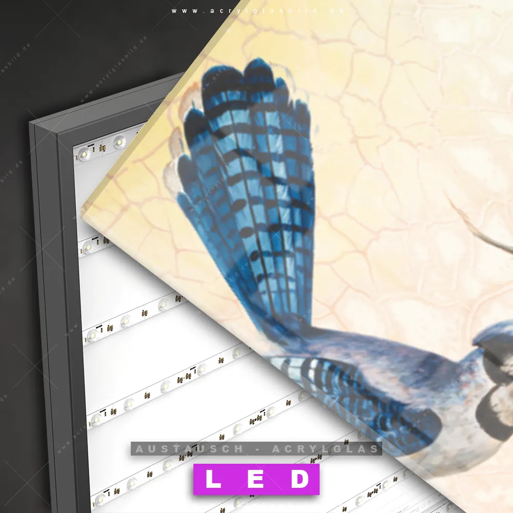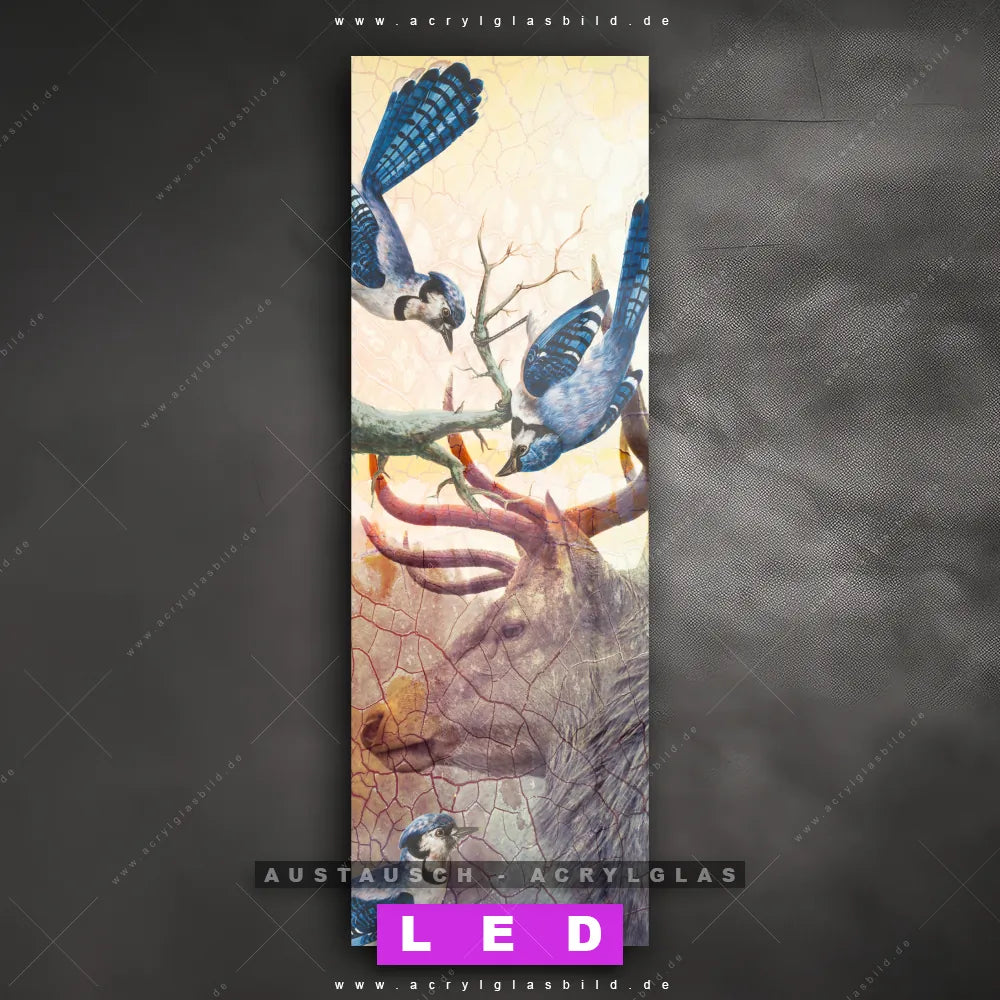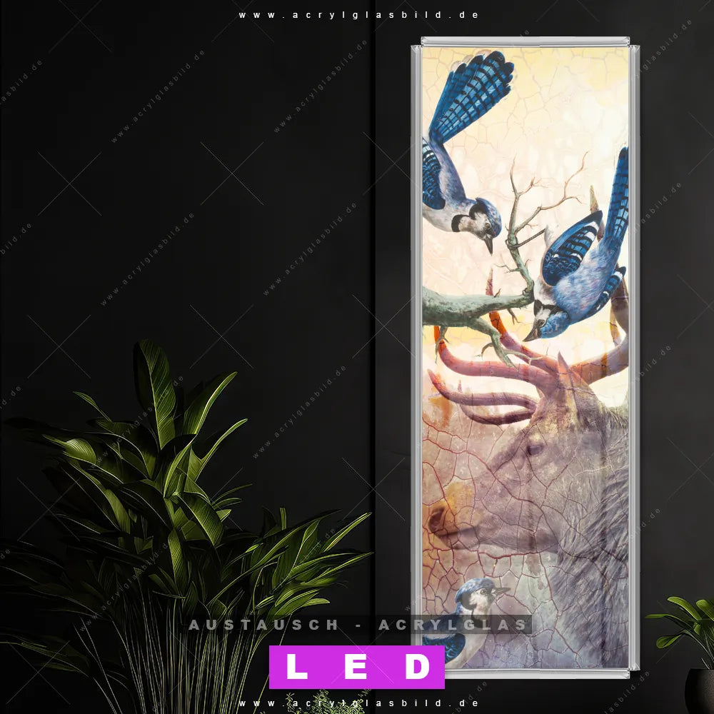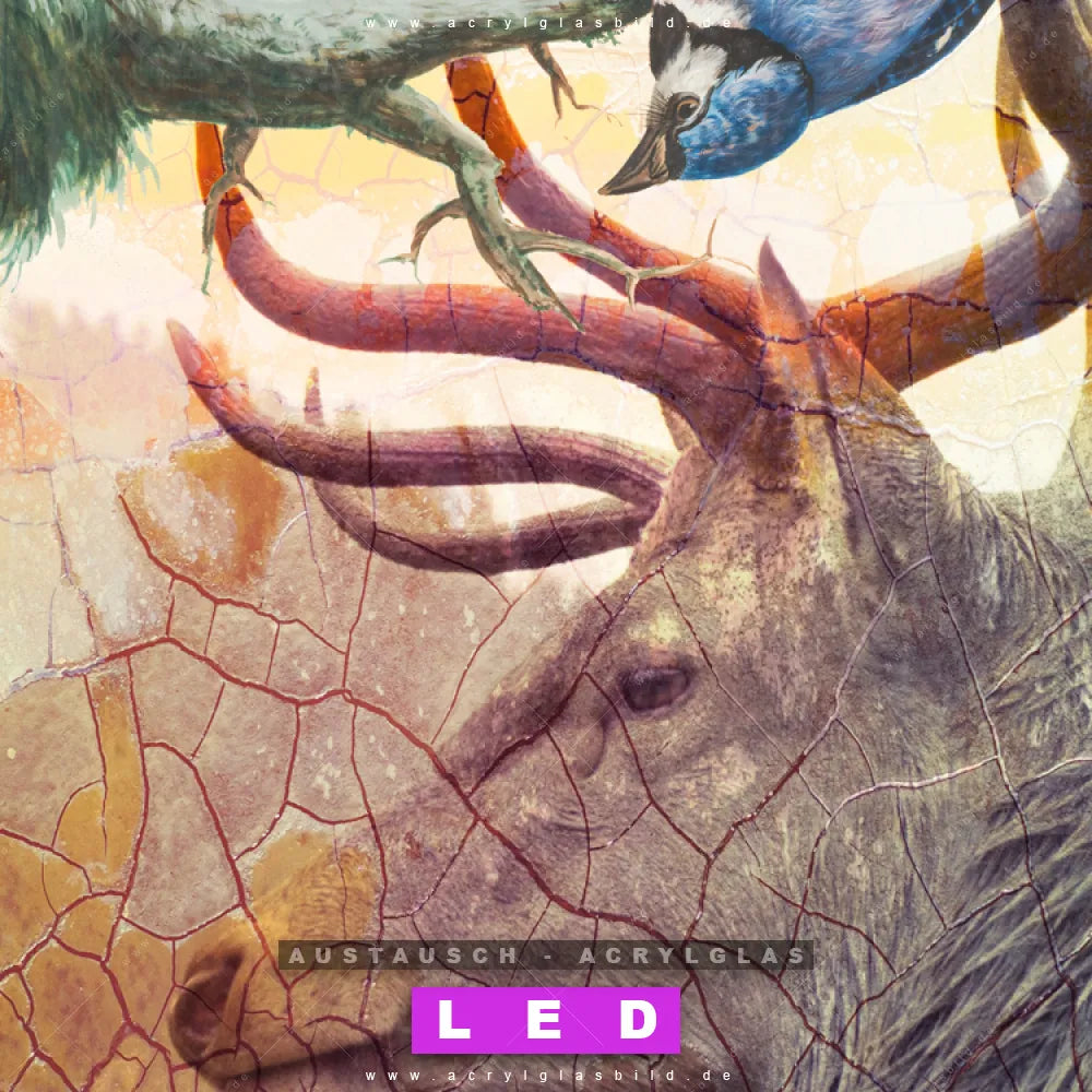 Begriffe wie Hirsch, Deer, Wald, Natur, skandinavisch, Bäume, Vögel haben dich auf der Suche nach deinem neuen Austausch-Acrylglasbild inspiriert? Dann sollte das Wechsel-Acrylglasbild Hirsch und Blauhäher in harmonischer Koexistenz für dein bereits vorhandenes LED Acrylglasbild Canvalight® DIA den Weg zu dir finden.