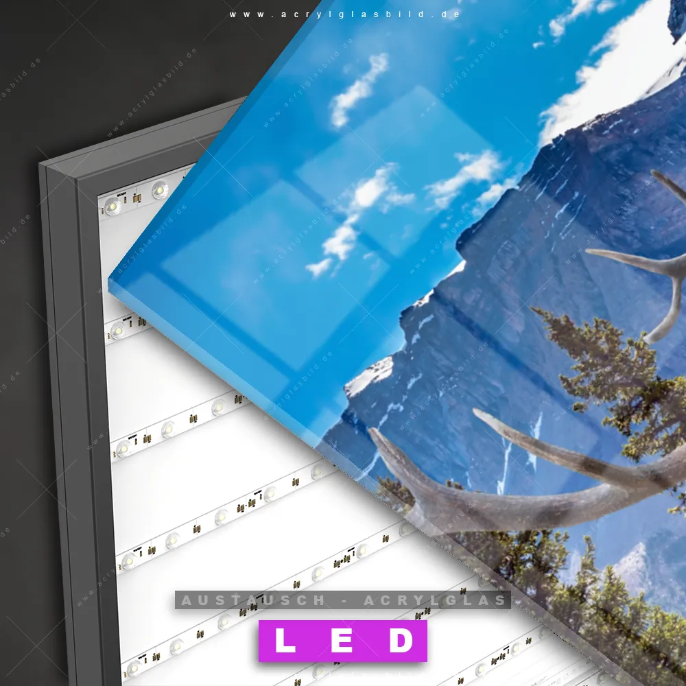 Begriffe wie Wald, Landschaft, Bäume, Natur, Hirsch, Deer, Wild, Rotwild, Berge, Bergkette, Bergkulisse, Nadelwald haben dich auf der Suche nach deinem neuen Austausch-Acrylglasbild inspiriert? Dann sollte das Wechsel-Acrylglasbild Hirsch in den Bergen für dein bereits vorhandenes LED Acrylglasbild Canvalight® DIA den Weg zu dir finden.