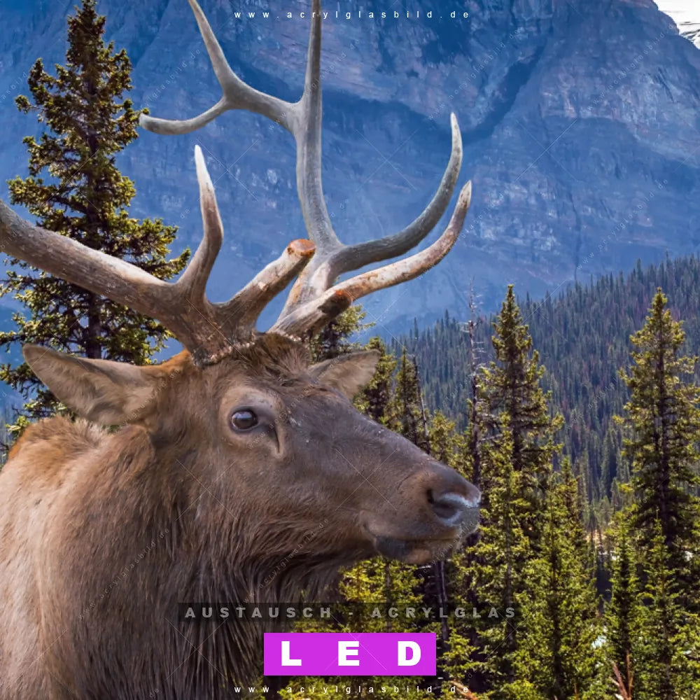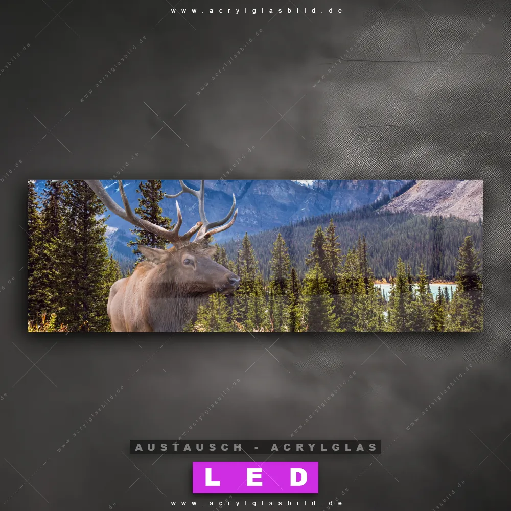 Begriffe wie Wald, Landschaft, Bäume, Natur, Hirsch, Deer, Wild, Rotwild, Berge, Bergkette, Bergkulisse, Nadelwald haben dich auf der Suche nach deinem neuen Austausch-Acrylglasbild inspiriert? Dann sollte das Wechsel-Acrylglasbild Hirsch in den Bergen für dein bereits vorhandenes LED Acrylglasbild Canvalight® DIA den Weg zu dir finden.