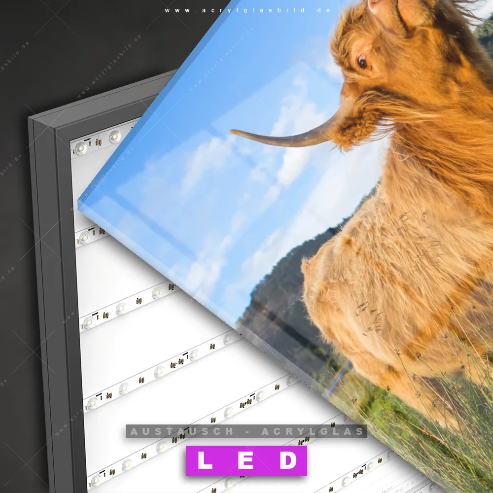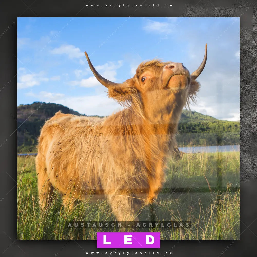 Begriffe wie Tier, Stier, Hochlandkuh, Highlander, Büffel, Rind, Bulle, Hochland, Hochlandrind haben dich auf der Suche nach deinem neuen Austausch-Acrylglasbild inspiriert? Dann sollte das Wechsel-Acrylglasbild Hochlandrind auf grüner Wiese für dein bereits vorhandenes LED Acrylglasbild Canvalight® DIA den Weg zu dir finden.