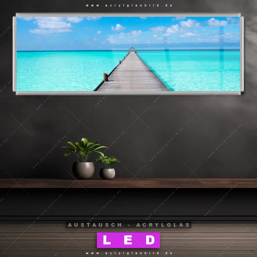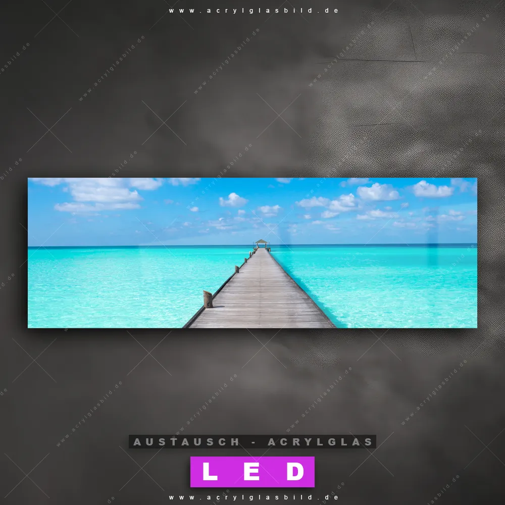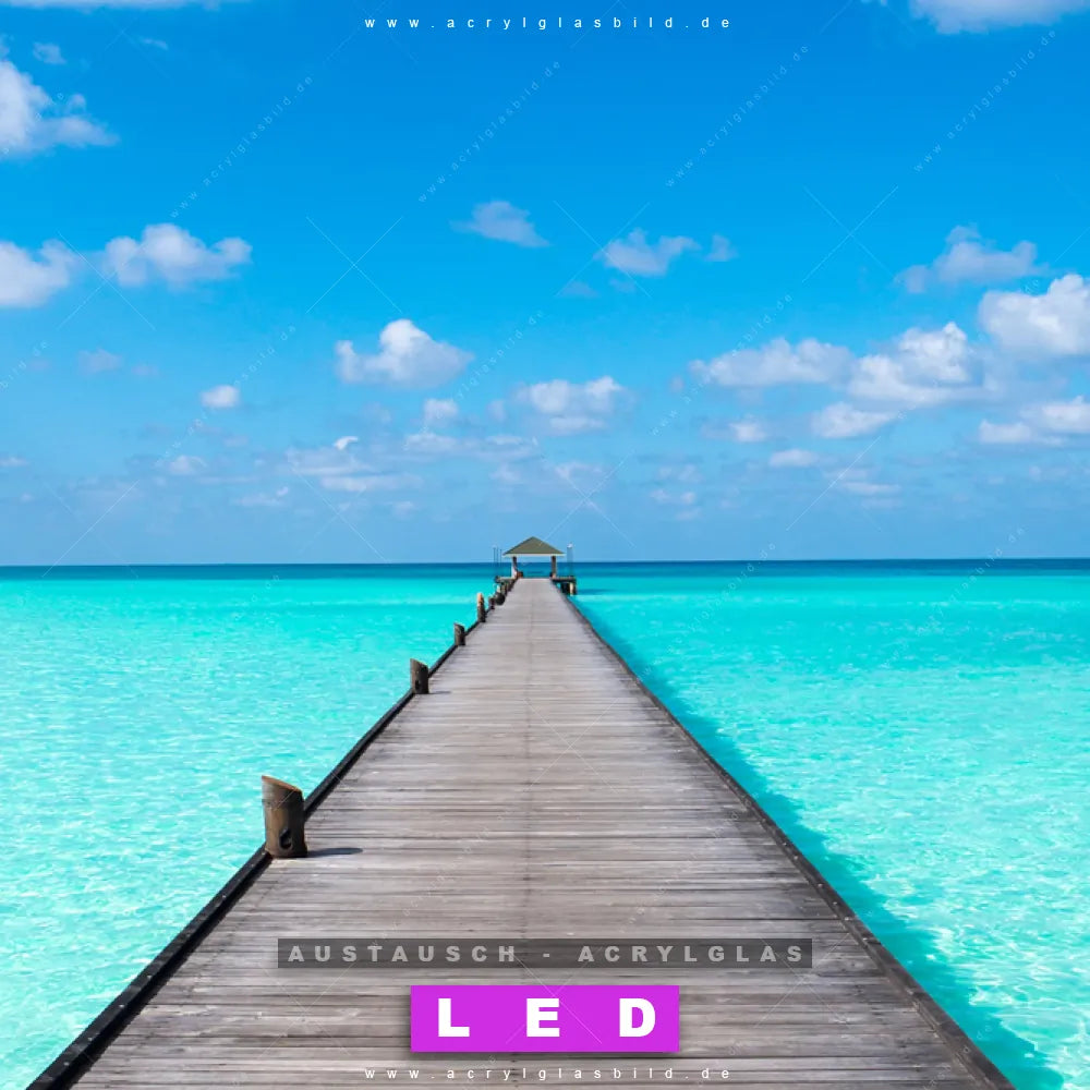 Begriffe wie Meer, Steg, Strand, Sommer, Weg, Südsee - Karibik, Urlaub - Reisen haben dich auf der Suche nach deinem neuen Austausch-Acrylglasbild inspiriert? Dann sollte das Wechsel-Acrylglasbild Pier im türkis-blauen Meer für dein bereits vorhandenes LED Acrylglasbild Canvalight® DIA den Weg zu dir finden.