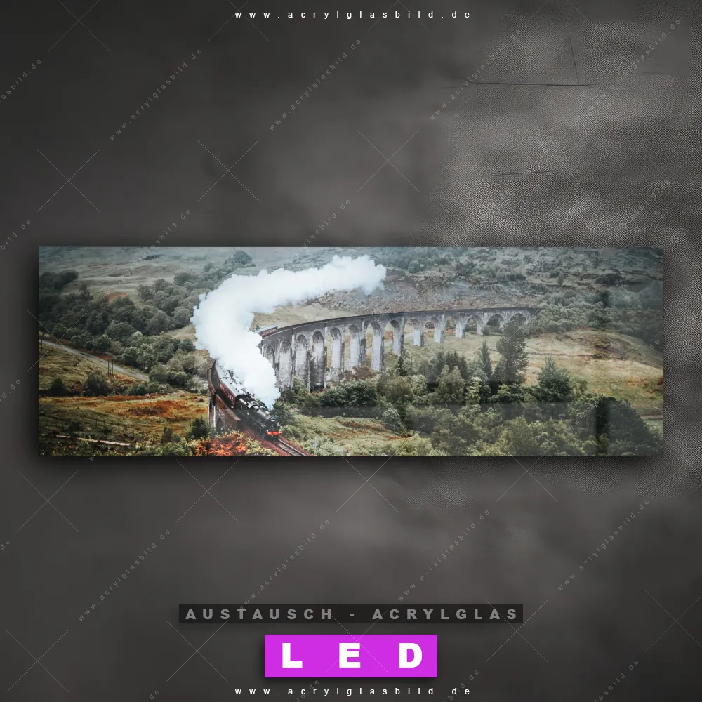 Begriffe wie Hogwarts-Zug, Dampfzug, Glenfinnan-Viadukt, Schottland, Brücke, Eisenbahn haben dich auf der Suche nach deinem neuen Austausch-Acrylglasbild inspiriert? Dann sollte das Wechsel-Acrylglasbild Zug auf großer Brücke für dein bereits vorhandenes LED Acrylglasbild Canvalight® DIA den Weg zu dir finden.