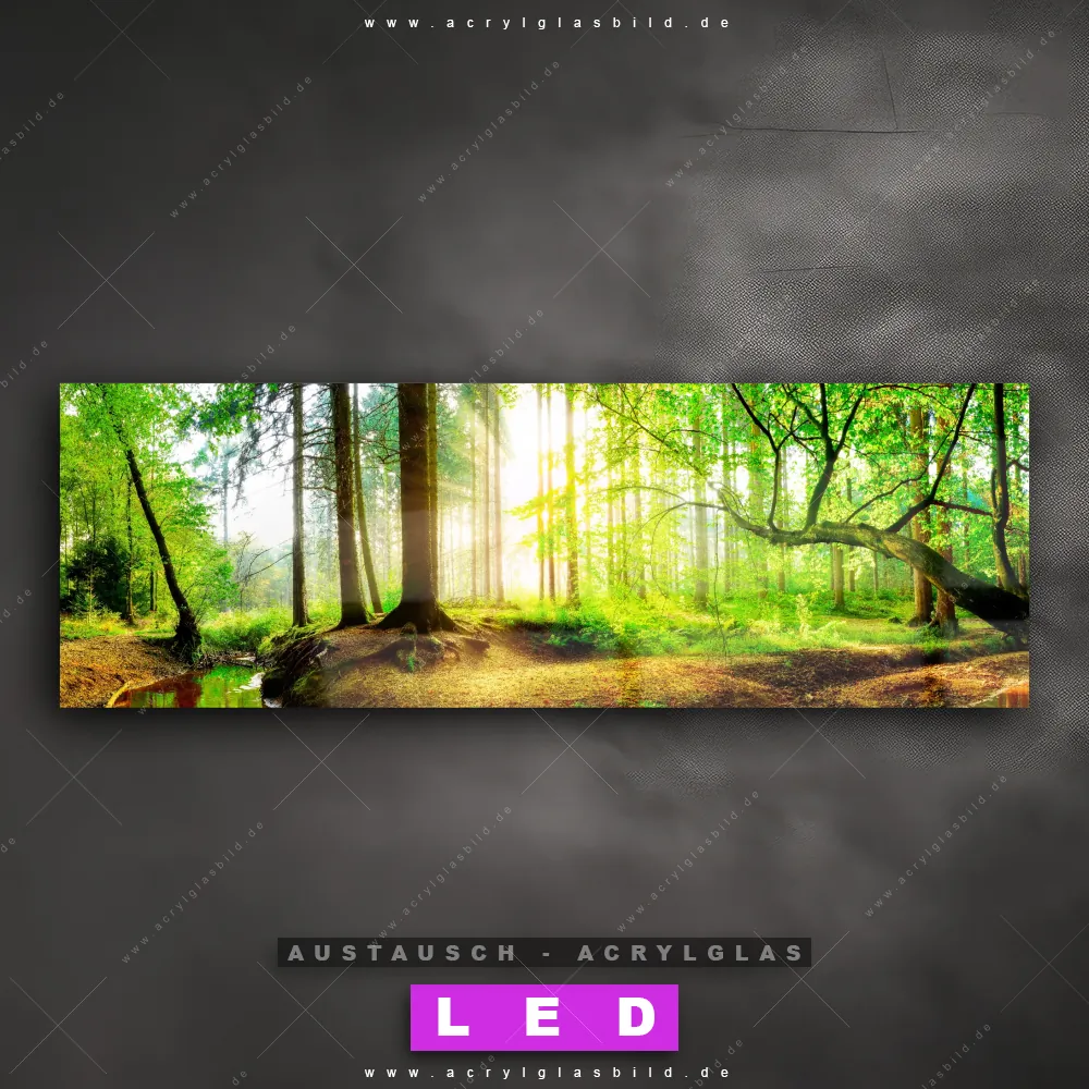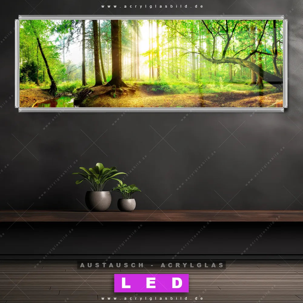 Wechsel-Acrylglas Canvalight® DIA | Idyllischer Wald bei Sonnenaufgang | Panorama