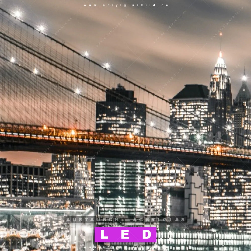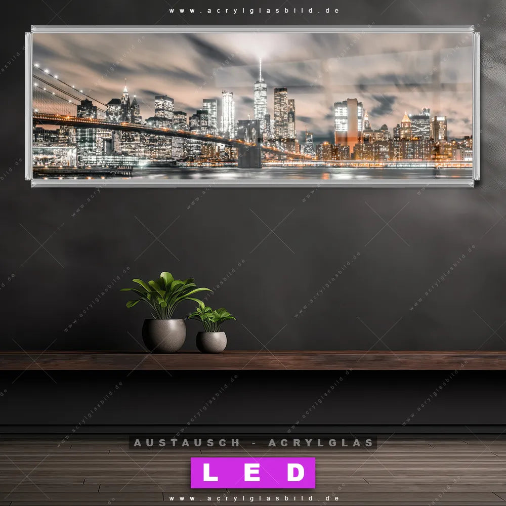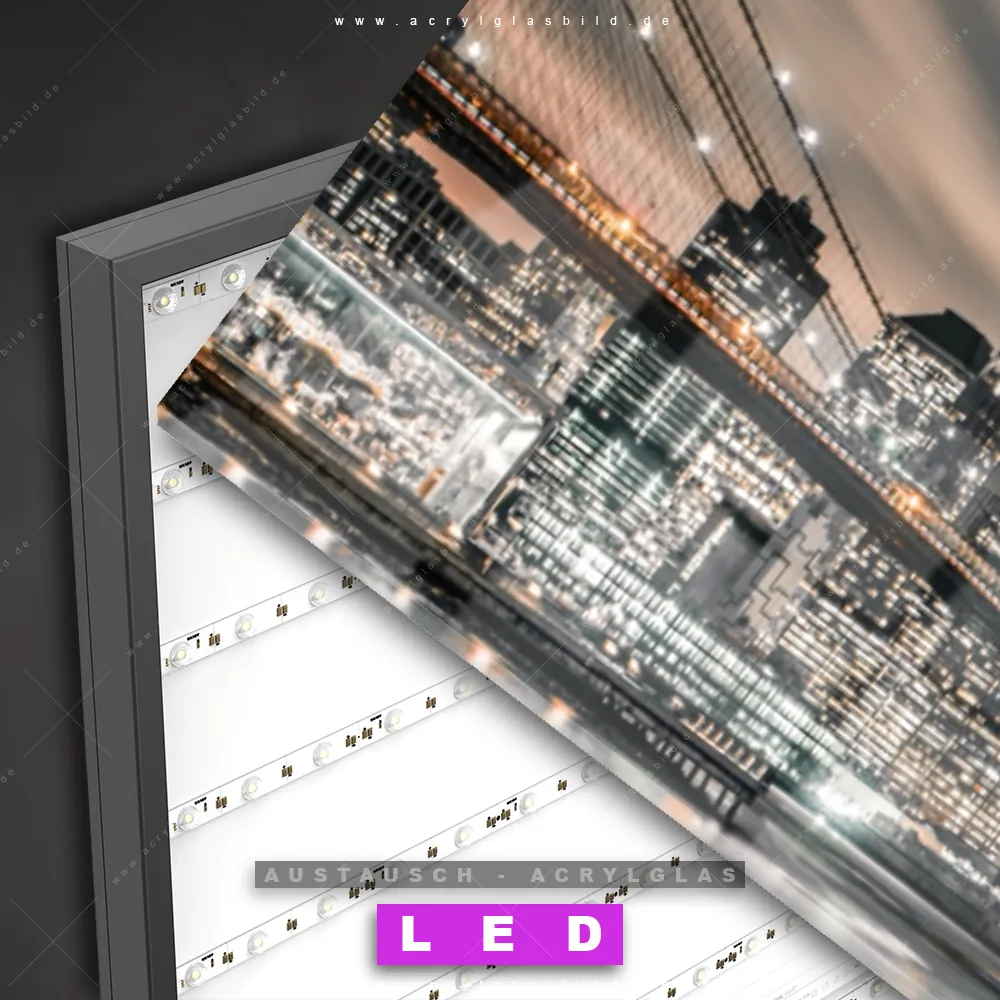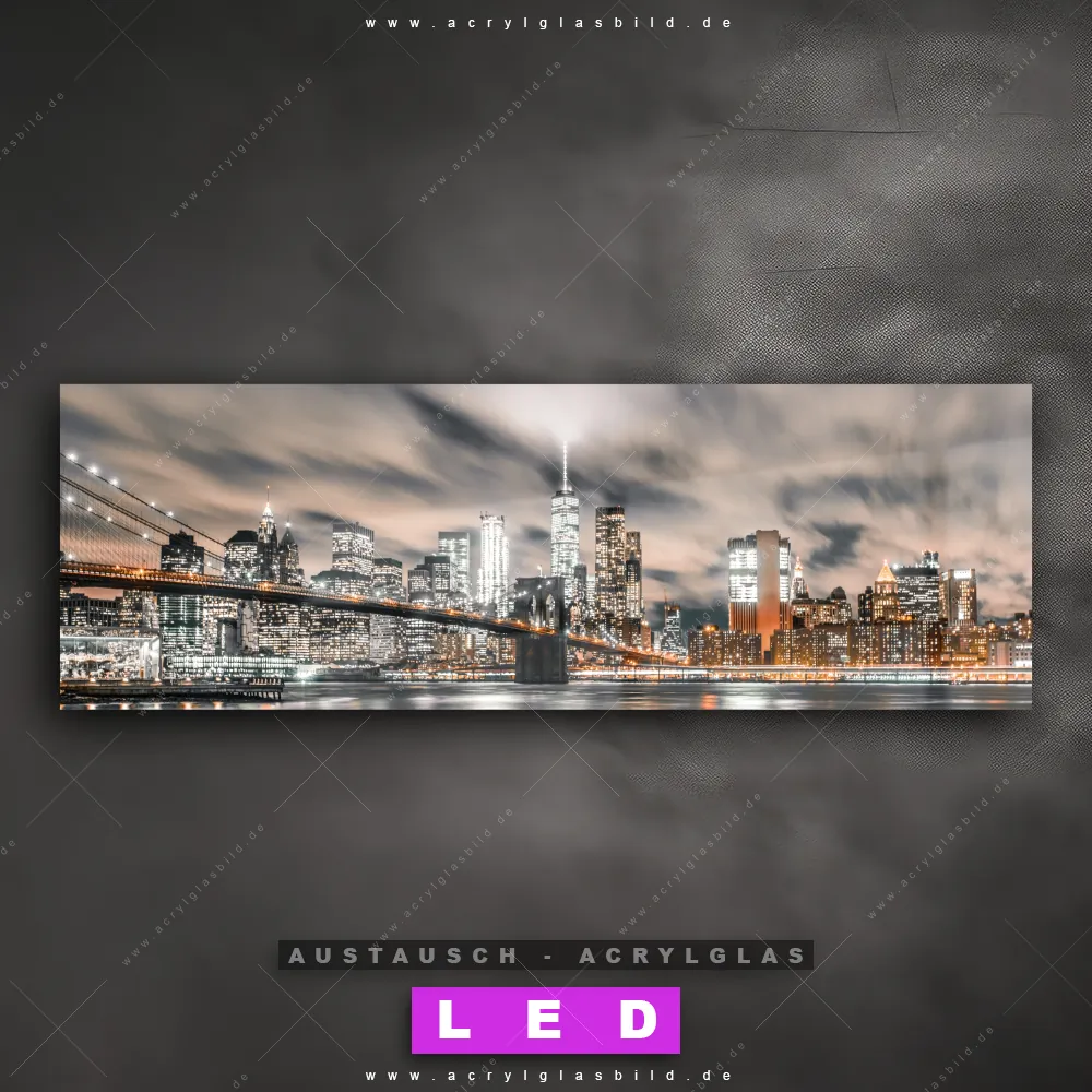 Begriffe wie Stadt, Skyline, Himmel, Manhatten, New York, Amerika, Sonnenuntergang, Nacht, Metropole, Abend haben dich auf der Suche nach deinem neuen Austausch-Acrylglasbild inspiriert? Dann sollte das Wechsel-Acrylglasbild nächtliche Skyline NYC für dein bereits vorhandenes LED Acrylglasbild Canvalight® DIA den Weg zu dir finden.
