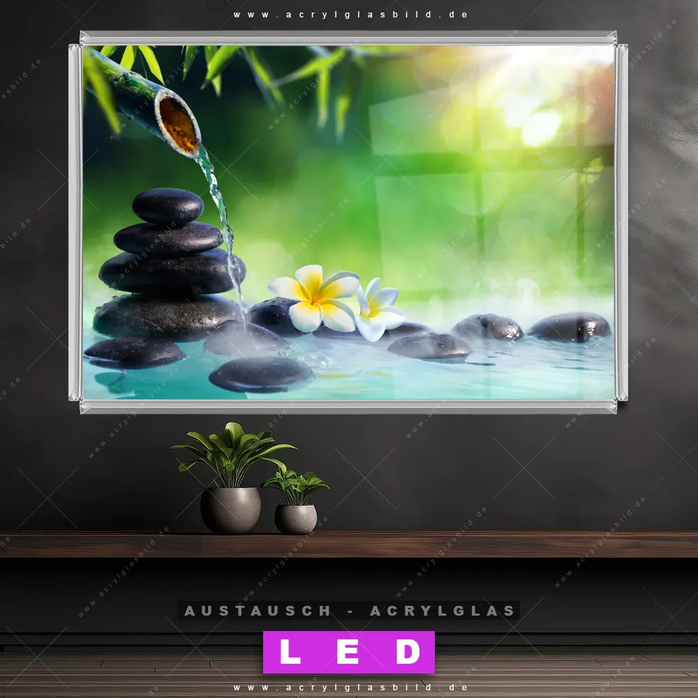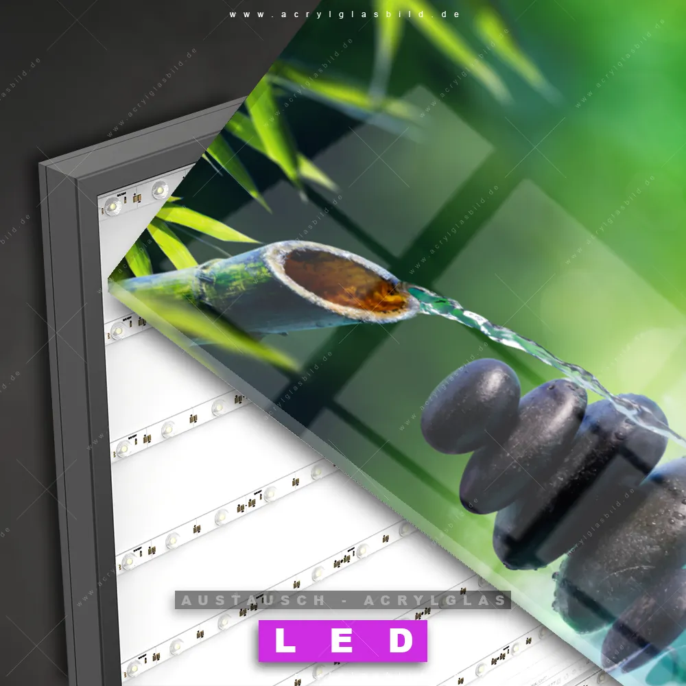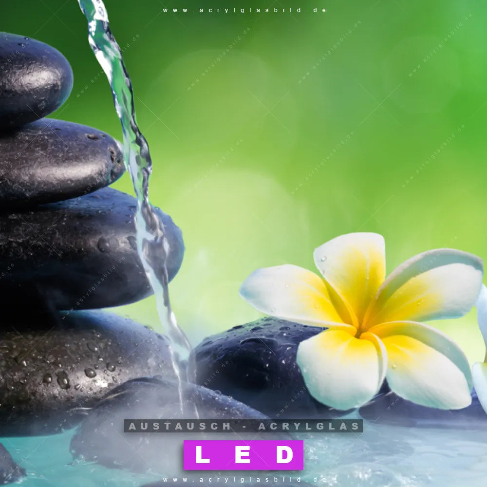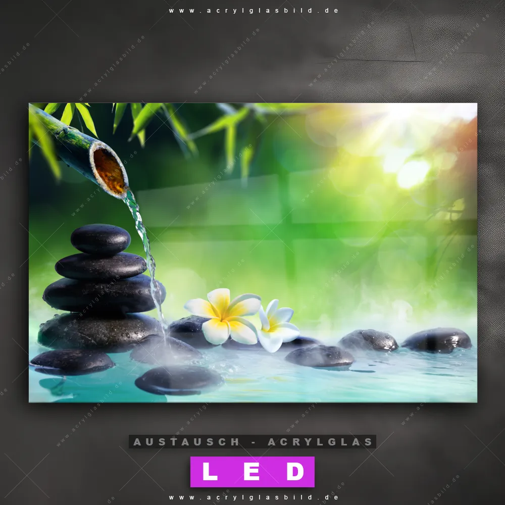 Begriffe wie Buddhismus, Religion, Feng Shui, Zen, Meditation, Bambus, Zengarten, Steine, Zensteine, Blumen, Blüte, Lilie, Brunnen, Wasser haben dich auf der Suche nach deinem neuen Austausch-Acrylglasbild inspiriert? Dann sollte das Wechsel-Acrylglasbild Brunnen mit Zen-Steinen für dein bereits vorhandenes LED Acrylglasbild Canvalight® DIA den Weg zu dir finden.