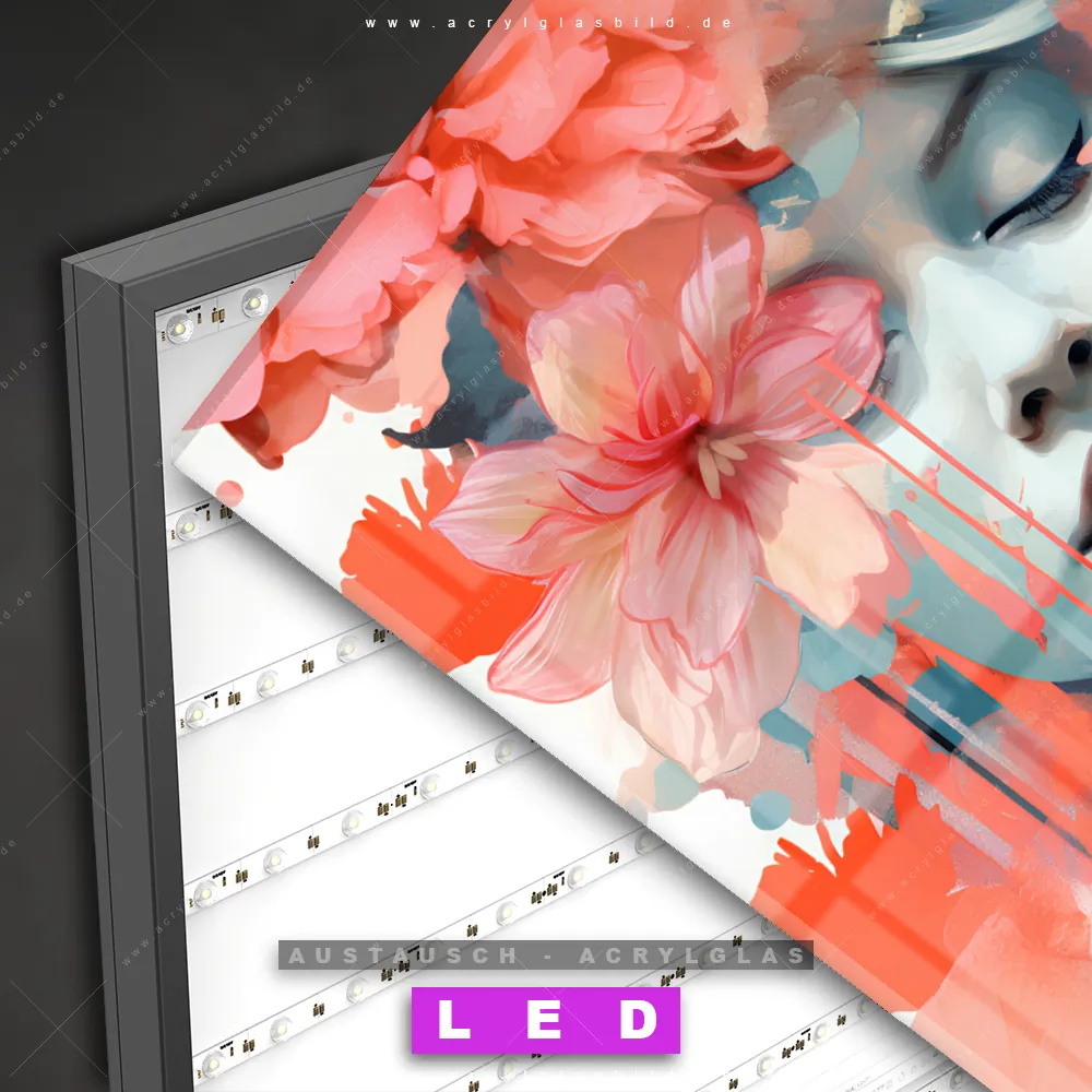 Begriffe wie Menschen & Blumen, Frau, Porträt, Gesicht, Blumen, Blüten, Frisur, Haare haben dich auf der Suche nach deinem neuen Austausch-Acrylglasbild inspiriert? Dann sollte das Wechsel-Acrylglasbild Schönes Mädchen mit Blumenfrisur für dein bereits vorhandenes LED Acrylglasbild Canvalight® DIA den Weg zu dir finden.