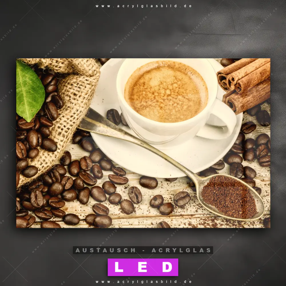 Begriffe wie Kaffee, Coffee, Kaffebohnen, Espresso, Genuss, Barista, Kaffeegenuss, Tasse haben dich auf der Suche nach deinem neuen Austausch-Acrylglasbild inspiriert? Dann sollte das Wechsel-Acrylglasbild Duft von Kaffee für dein bereits vorhandenes LED Acrylglasbild Canvalight® DIA den Weg zu dir finden.