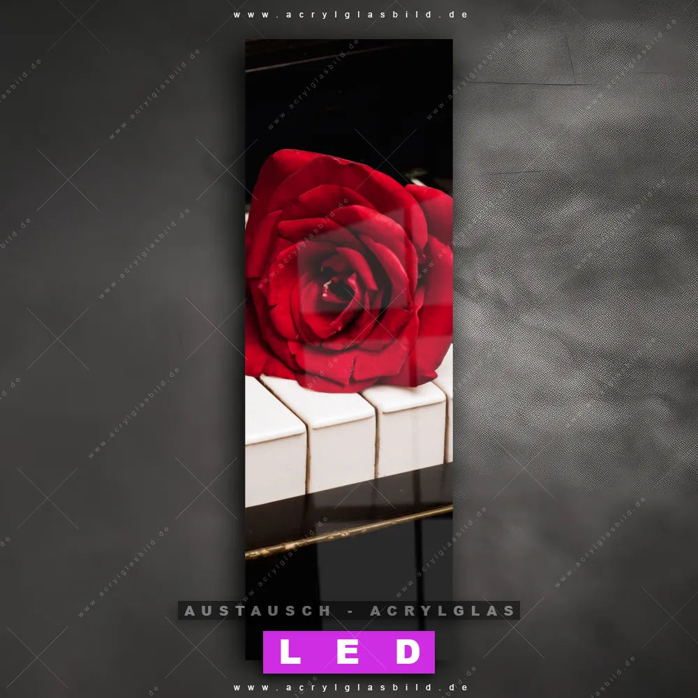 Begriffe wie Musik, Instrument, musikalisch, Klavier, Blüte, Blume, Rose haben dich auf der Suche nach deinem neuen Austausch-Acrylglasbild inspiriert? Dann sollte das Wechsel-Acrylglasbild rote Rose auf Klaviatur für dein bereits vorhandenes LED Acrylglasbild Canvalight® DIA den Weg zu dir finden.