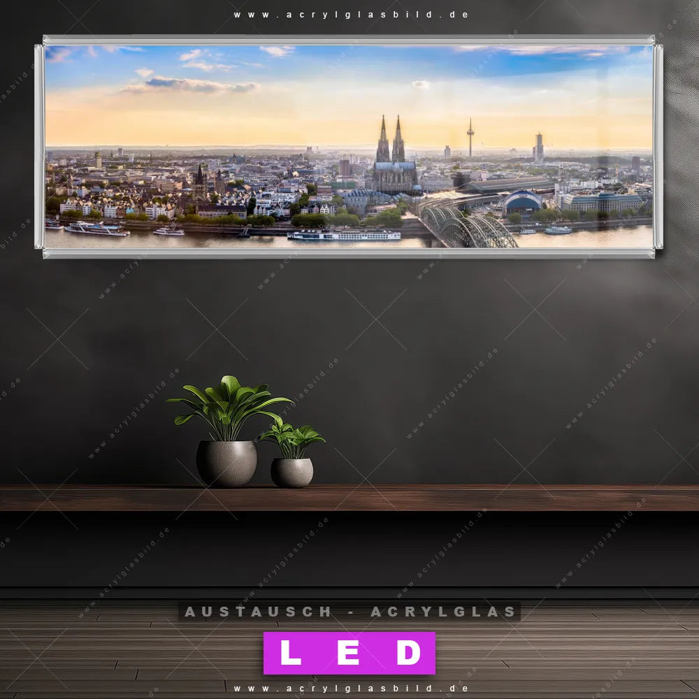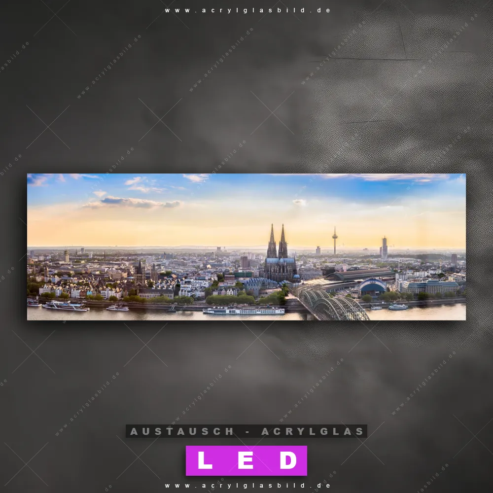 Begriffe wie Sehenswürdigkeiten, Skyline, Häuser, Köln, Deutschland, Rhein, Kölner Dom haben dich auf der Suche nach deinem neuen Austausch-Acrylglasbild inspiriert? Dann sollte das Wechsel-Acrylglasbild Panorama von Köln für dein bereits vorhandenes LED Acrylglasbild Canvalight® DIA den Weg zu dir finden.