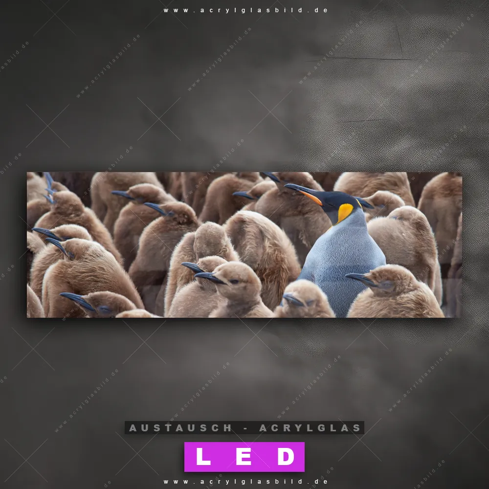 Begriffe wie Vogel, Pinguin, Wasser, Eis, Königspinguine, Pinguinbabys, Kücken haben dich auf der Suche nach deinem neuen Austausch-Acrylglasbild inspiriert? Dann sollte das Wechsel-Acrylglasbild Nachwuchs Pinguine für dein bereits vorhandenes LED Acrylglasbild Canvalight® DIA den Weg zu dir finden.