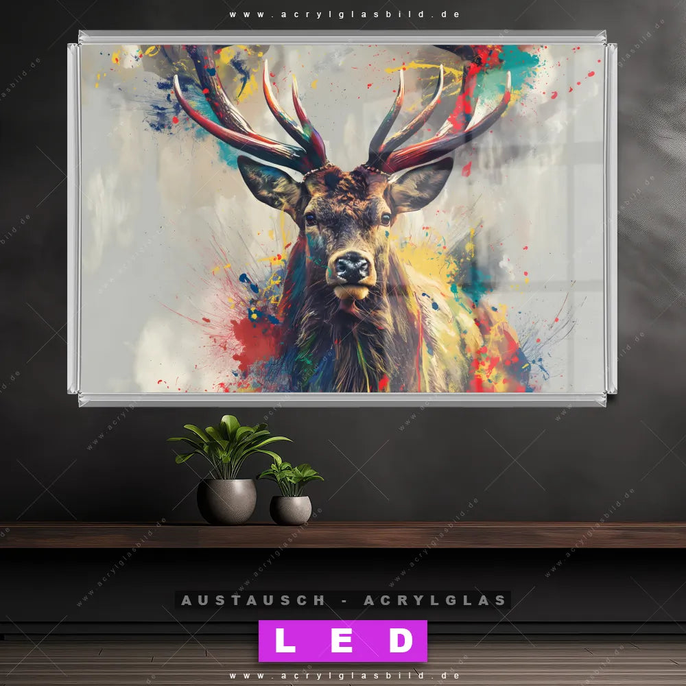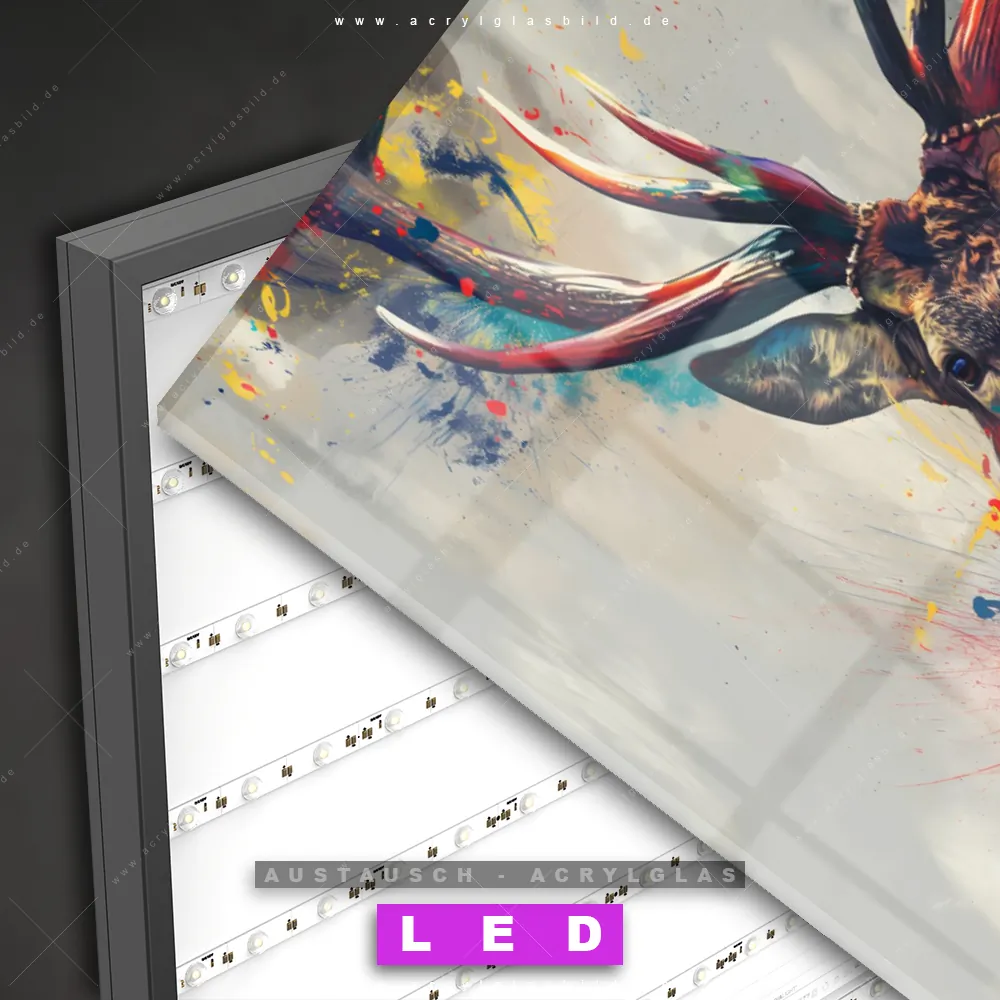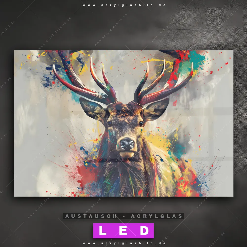 Begriffe wie Hirsch, Geweih, Magie, Rotwild, Rothirsch, Farbexplosion, Farbspritzer haben dich auf der Suche nach deinem neuen Austausch-Acrylglasbild inspiriert? Dann sollte das Wechsel-Acrylglasbild Moderne Hirschkunst für dein bereits vorhandenes LED Acrylglasbild Canvalight® DIA den Weg zu dir finden.