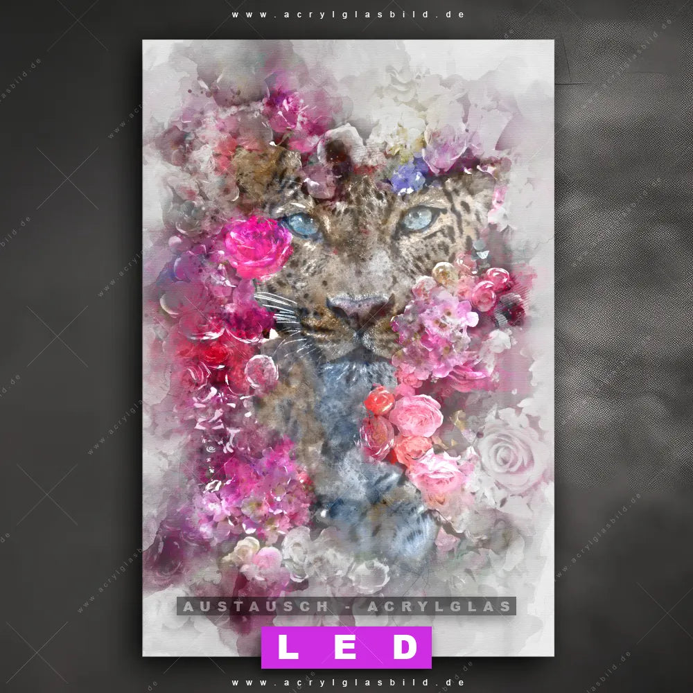Begriffe wie Tiere & Blumen, Tier, Blumen, Leopard, Kunst, Aquarell, Jaguar, Gepard, Raubkatze, Blüten, Rosen haben dich auf der Suche nach deinem neuen Austausch-Acrylglasbild inspiriert? Dann sollte das Wechsel-Acrylglasbild Leopard umhüllt von aquarellierten Blüten für dein bereits vorhandenes LED Acrylglasbild Canvalight® DIA den Weg zu dir finden.