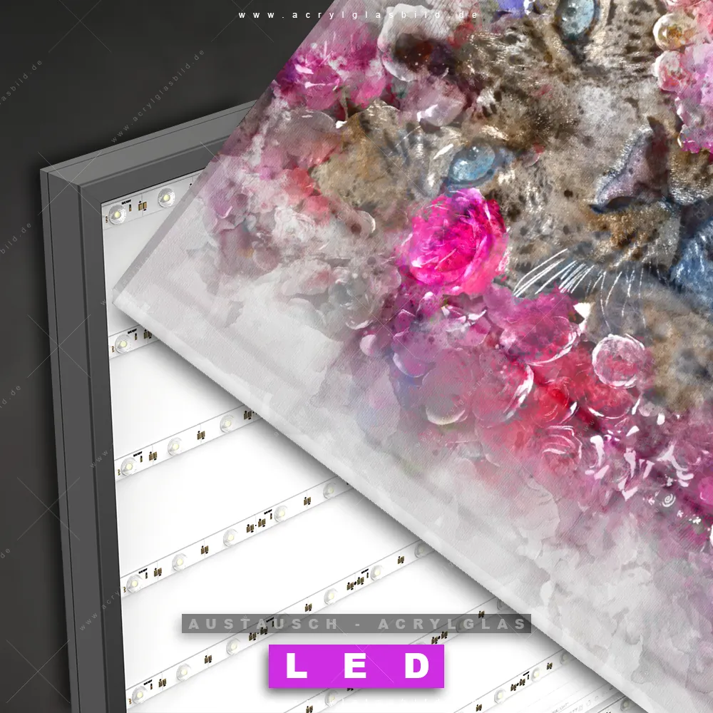Begriffe wie Tiere & Blumen, Tier, Blumen, Leopard, Kunst, Aquarell, Jaguar, Gepard, Raubkatze, Blüten, Rosen haben dich auf der Suche nach deinem neuen Austausch-Acrylglasbild inspiriert? Dann sollte das Wechsel-Acrylglasbild Leopard umhüllt von aquarellierten Blüten für dein bereits vorhandenes LED Acrylglasbild Canvalight® DIA den Weg zu dir finden.