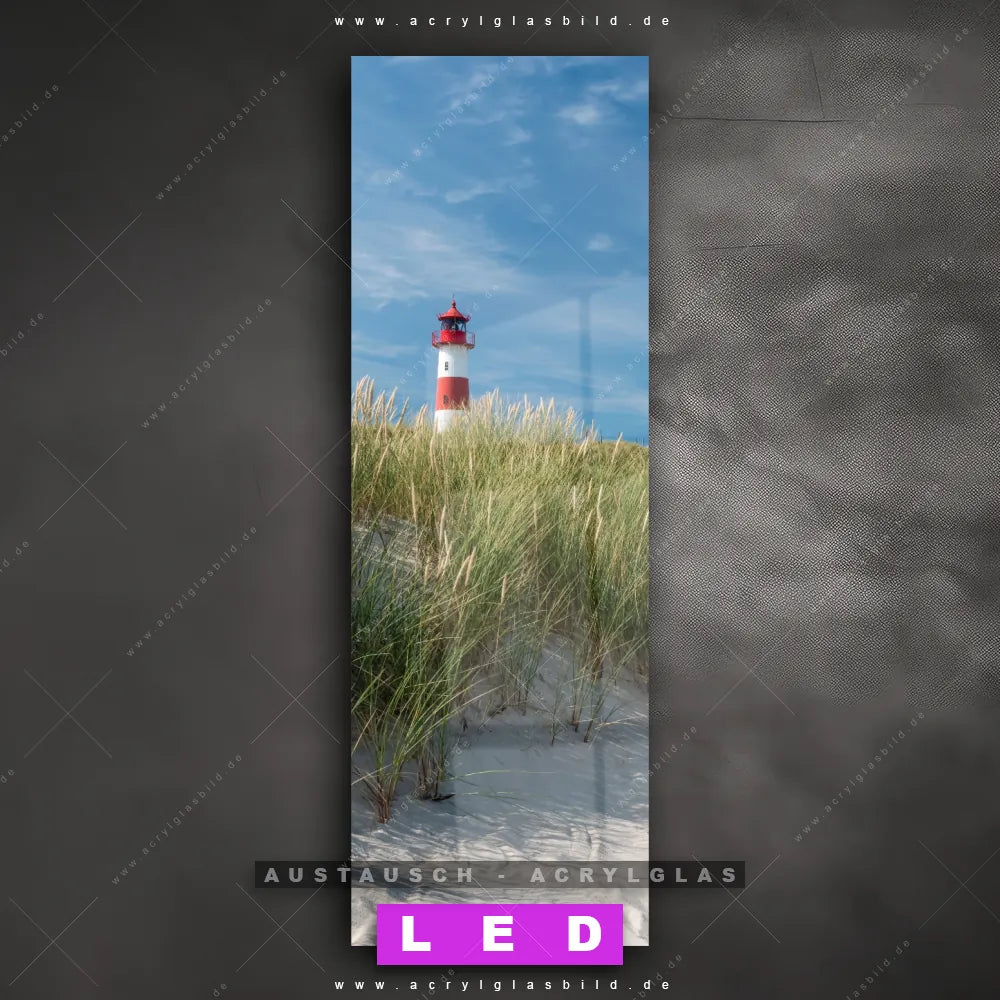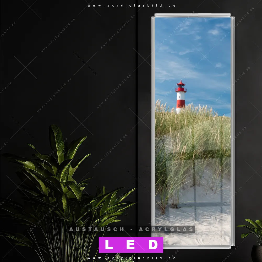 Begriffe wie Meer, Strand, Leuchtturm, Sommer, Deutschland, Reise, Düne, Ostsee, Nordsee, Gras haben dich auf der Suche nach deinem neuen Austausch-Acrylglasbild inspiriert? Dann sollte das Wechsel-Acrylglasbild Leuchtturm hinter Sanddünen für dein bereits vorhandenes LED Acrylglasbild Canvalight® DIA den Weg zu dir finden.