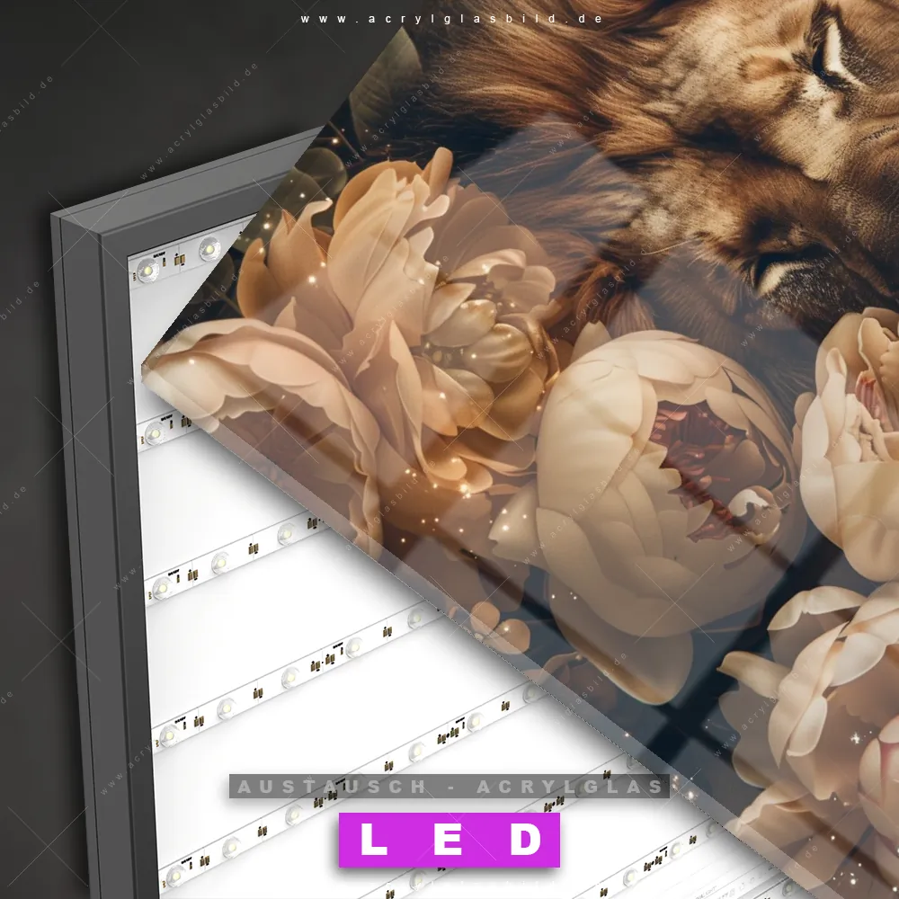 Begriffe wie Pflanze, Natur, Nahaufnahme, Raubkatze, Löwe, Blumen, Blüten haben dich auf der Suche nach deinem neuen Austausch-Acrylglasbild inspiriert? Dann sollte das Wechsel-Acrylglasbild Majestätischer Löwe im Blumenmeer für dein bereits vorhandenes LED Acrylglasbild Canvalight® DIA den Weg zu dir finden.
