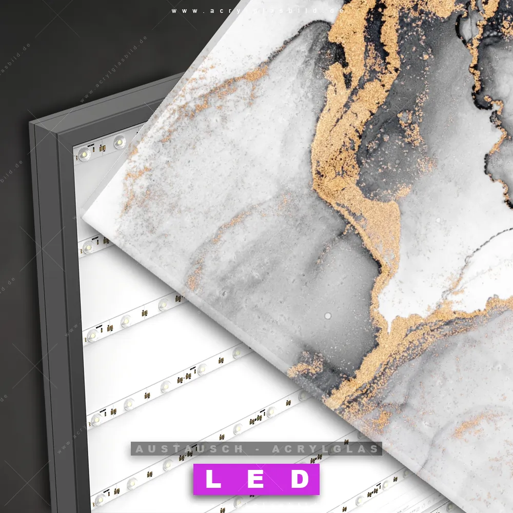 Begriffe wie Flüssigkeit, Acryl, flüssig, Farbe, Marmorierung, Fluid Art haben dich auf der Suche nach deinem neuen Austausch-Acrylglasbild inspiriert? Dann sollte das Wechsel-Acrylglasbild helles Marmor mit Highlights für dein bereits vorhandenes LED Acrylglasbild Canvalight® DIA den Weg zu dir finden.
