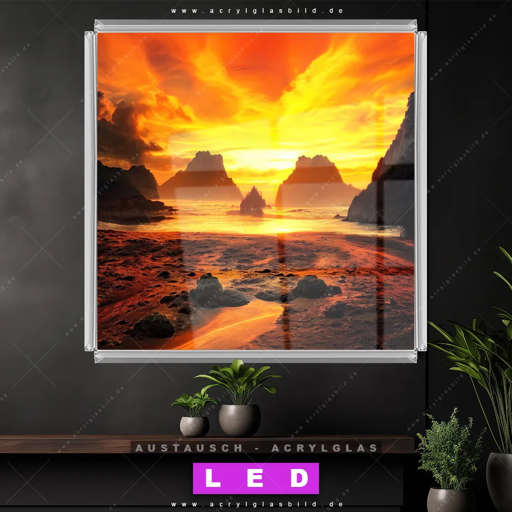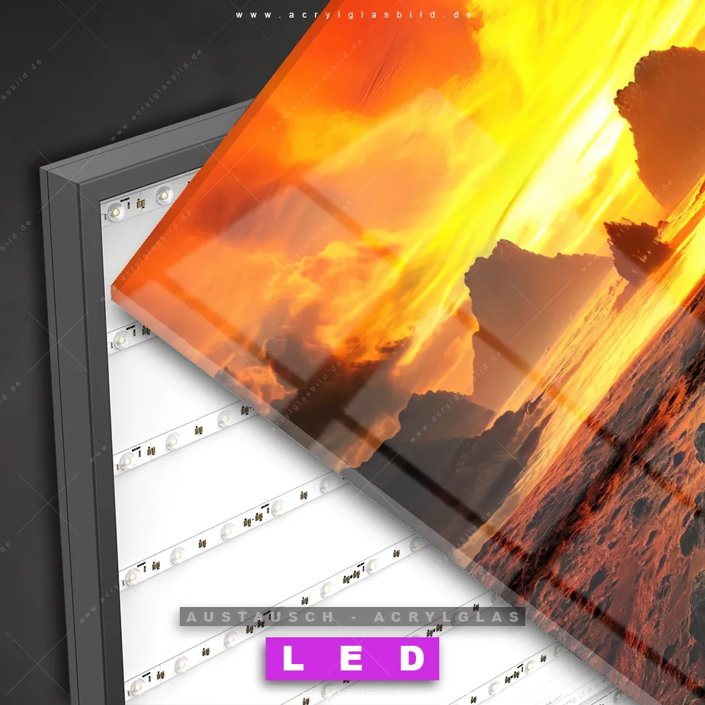 Begriffe wie Wasser, Ozean, Küste, Felsen, Abendrot, Ruhe, Sommer, Südsee - Karibik, Urlaub - Reisen, Sonnenuntergang - Sonnenaufgang haben dich auf der Suche nach deinem neuen Austausch-Acrylglasbild inspiriert? Dann sollte das Wechsel-Acrylglasbild Sonnenuntergang über der mystischen Küstenlandschaft für dein bereits vorhandenes LED Acrylglasbild Canvalight® DIA den Weg zu dir finden.