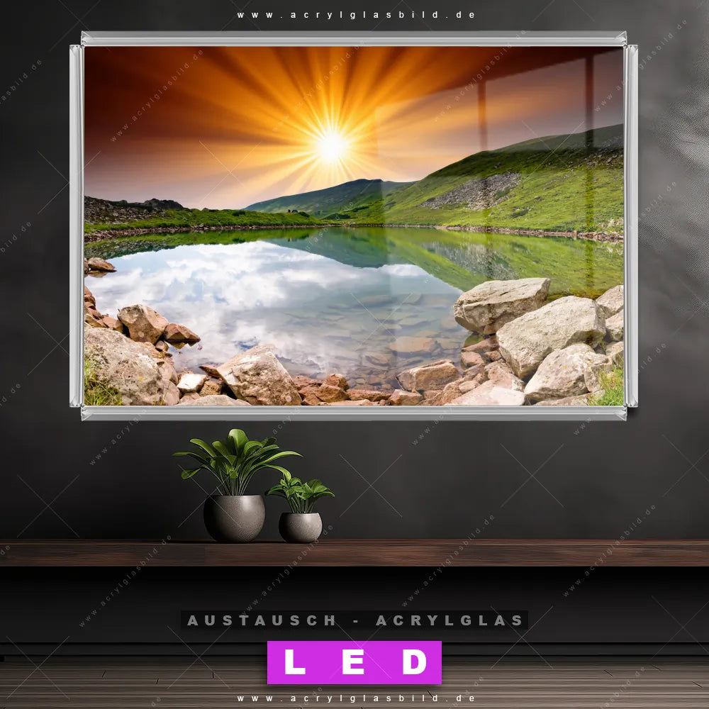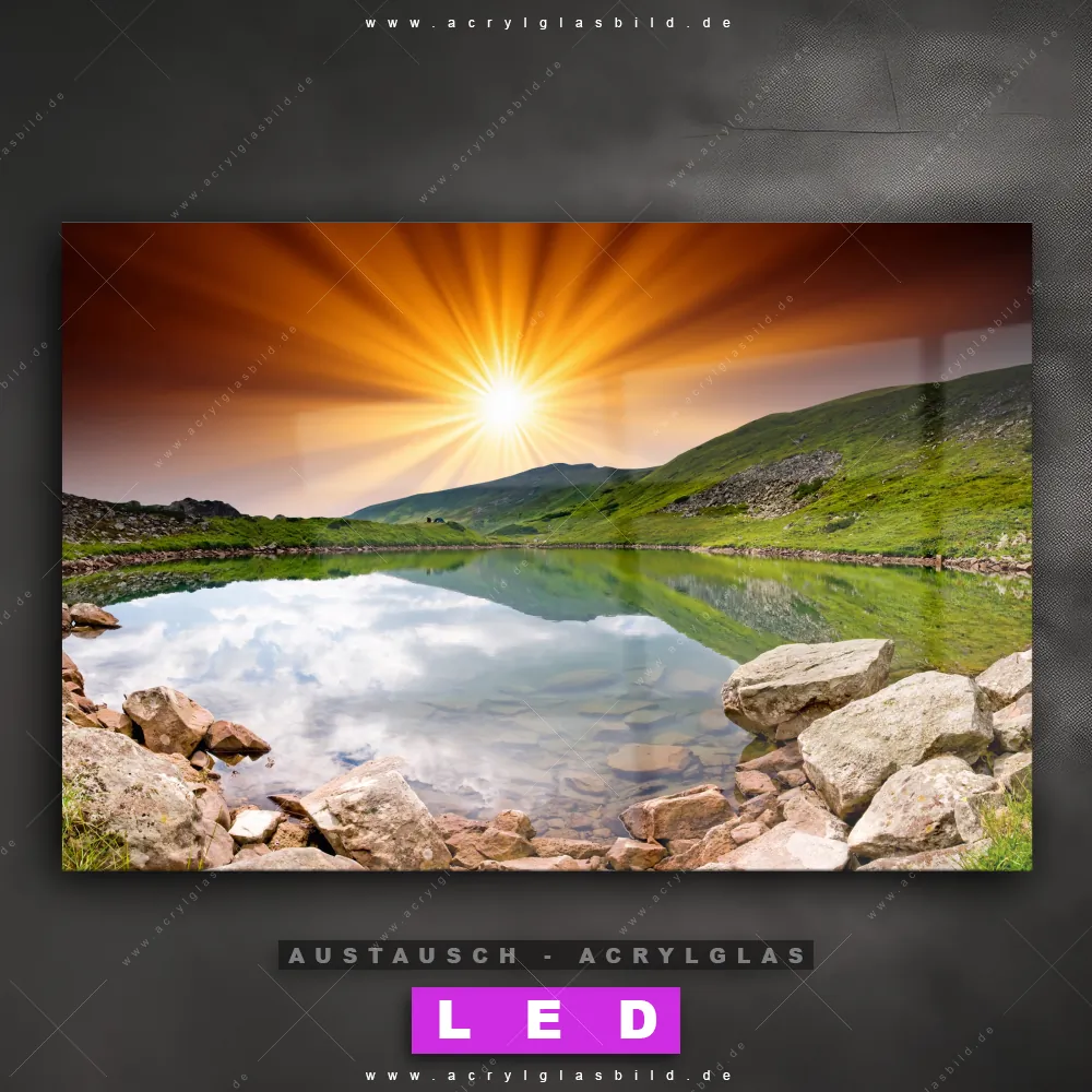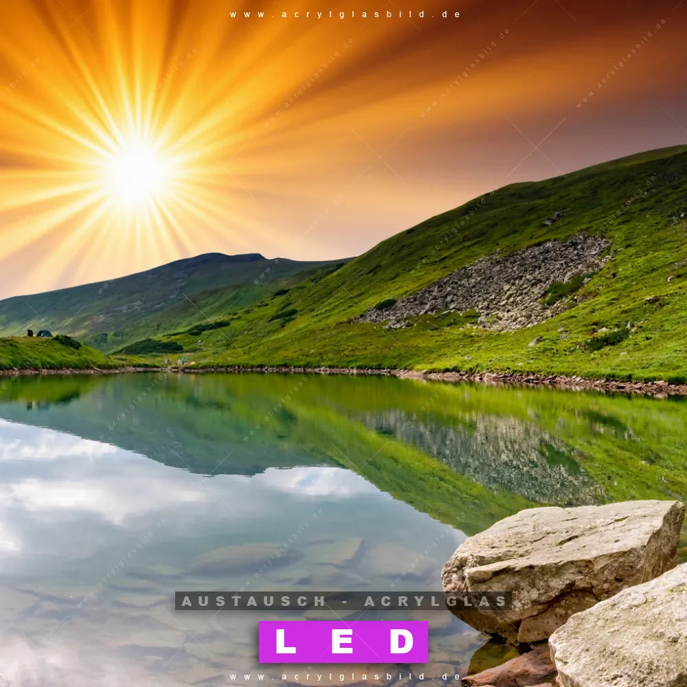Begriffe wie Landschaft, Natur, Stille, See, Wasser, Berge, Sonnenuntergang, Sonnenaufgang, Sonne, Gebirge haben dich auf der Suche nach deinem neuen Austausch-Acrylglasbild inspiriert? Dann sollte das Wechsel-Acrylglasbild Sonnenstrahlen über Bergsee für dein bereits vorhandenes LED Acrylglasbild Canvalight® DIA den Weg zu dir finden.