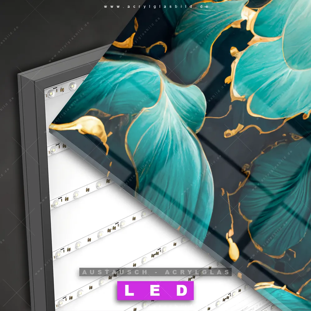 Wechsel-Acrylglas Canvalight® DIA | Marmor Blüten in türkis & gold | Hochformat