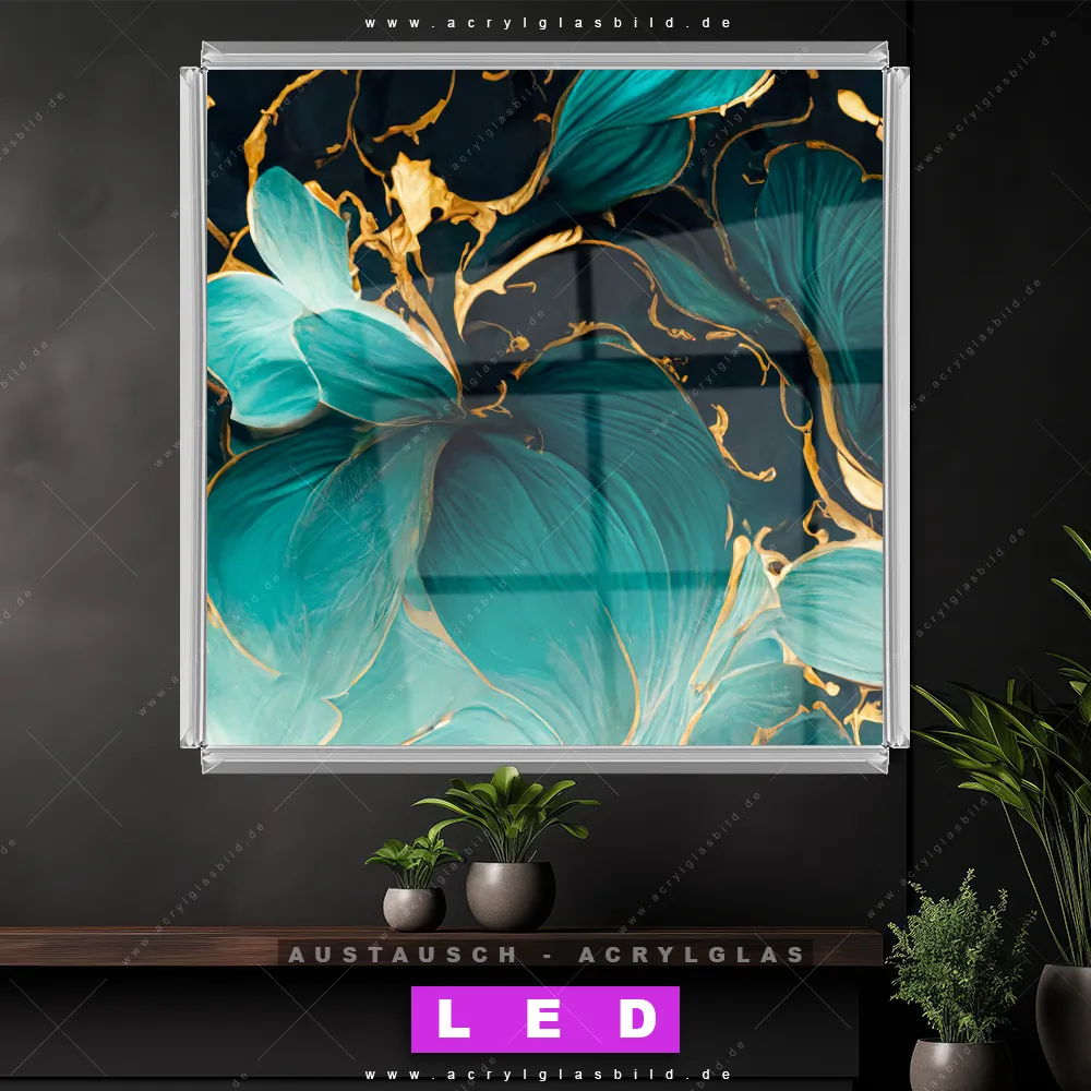 Wechsel-Acrylglas Canvalight® DIA | Marmor Blüten in türkis & gold | Quadrat