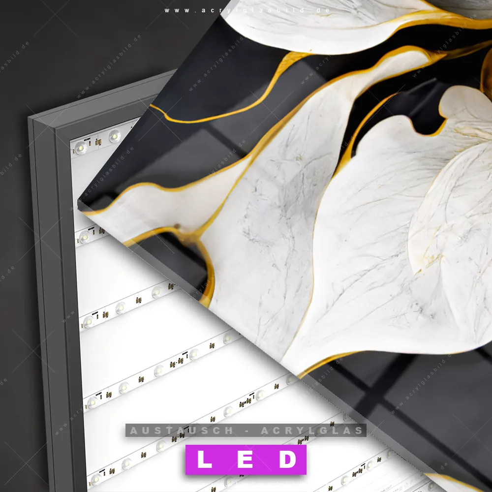Begriffe wie Marmor, Flüssigkeit, Acryl, flüssig, Farbe, Marmorierung, Blumen, Blüten, Wirbel, Kunst, kreativ haben dich auf der Suche nach deinem neuen Austausch-Acrylglasbild inspiriert? Dann sollte das Wechsel-Acrylglasbild Blütenzauber weiß-gold für dein bereits vorhandenes LED Acrylglasbild Canvalight® DIA den Weg zu dir finden.