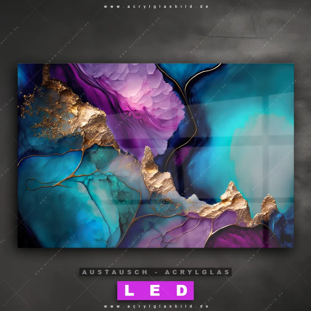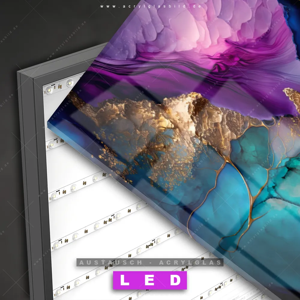 Begriffe wie Marmor, Flüssigkeit, Acryl, flüssig, Farbe, Marmorierung, Tinte, Fluid Art haben dich auf der Suche nach deinem neuen Austausch-Acrylglasbild inspiriert? Dann sollte das Wechsel-Acrylglasbild Fluid Art in lila, blau & gold für dein bereits vorhandenes LED Acrylglasbild Canvalight® DIA den Weg zu dir finden.