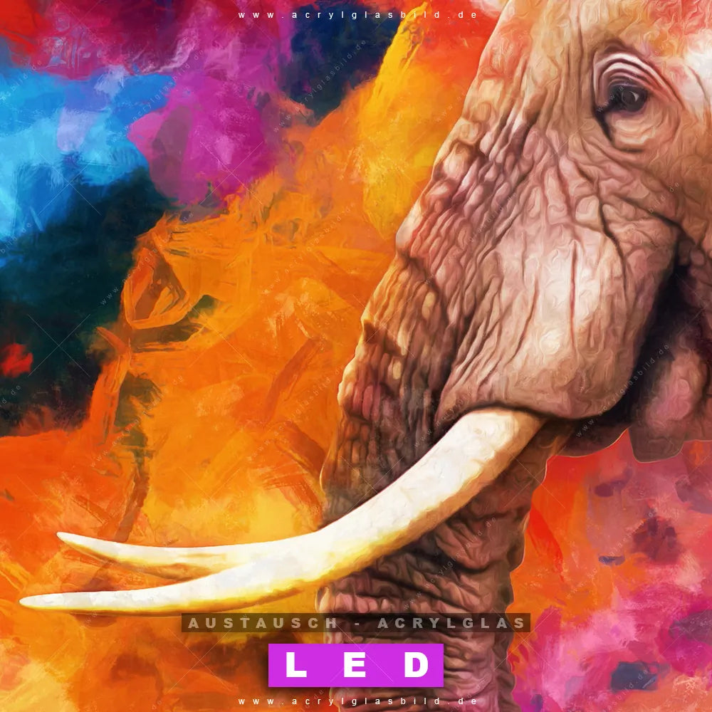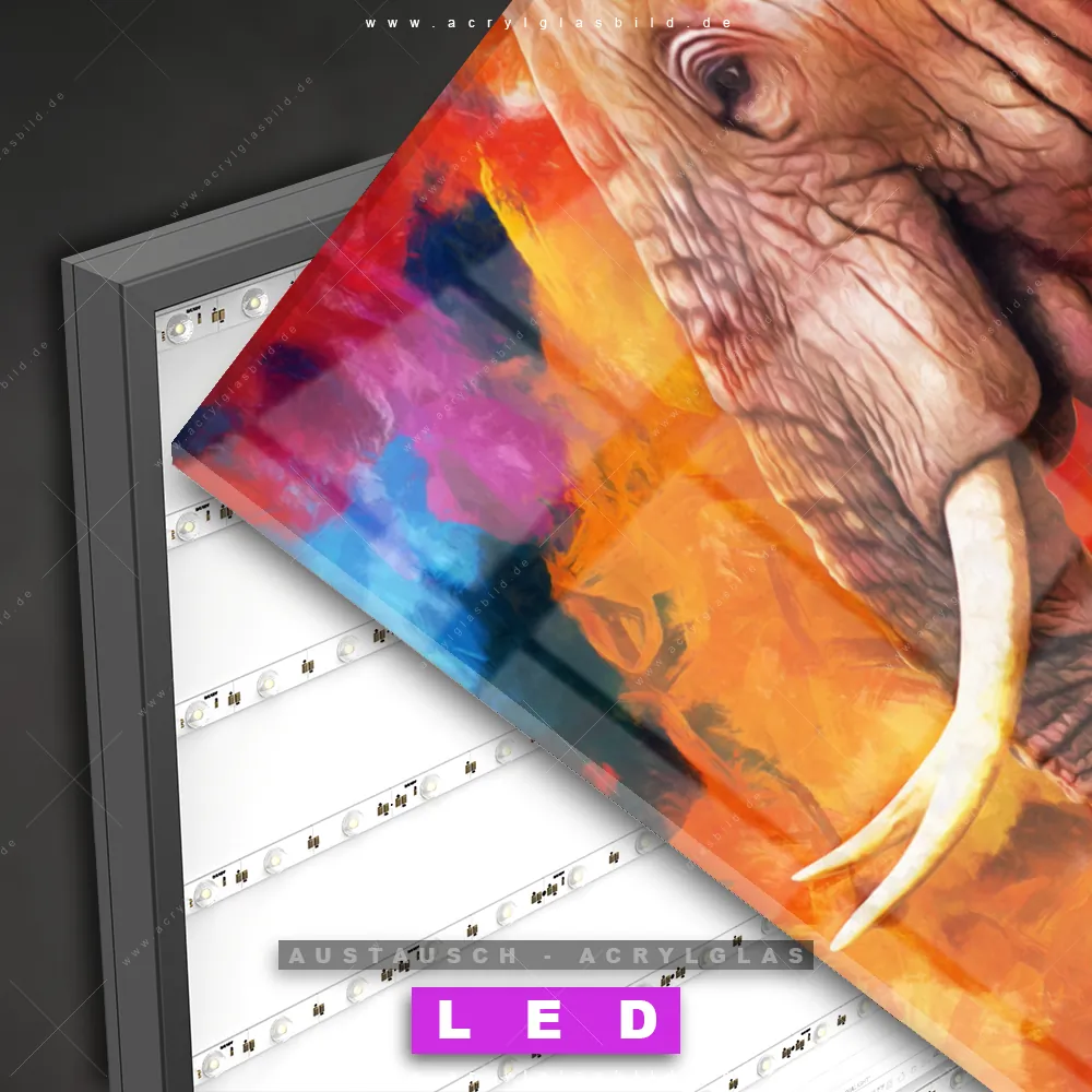 Begriffe wie Elefant, Safarie, Afrika, Big Five, Aquarell, Ölgemälde, Dickhäuter, Stoßzahn, Dschungel haben dich auf der Suche nach deinem neuen Austausch-Acrylglasbild inspiriert? Dann sollte das Wechsel-Acrylglasbild abstrakter Elefant für dein bereits vorhandenes LED Acrylglasbild Canvalight® DIA den Weg zu dir finden.