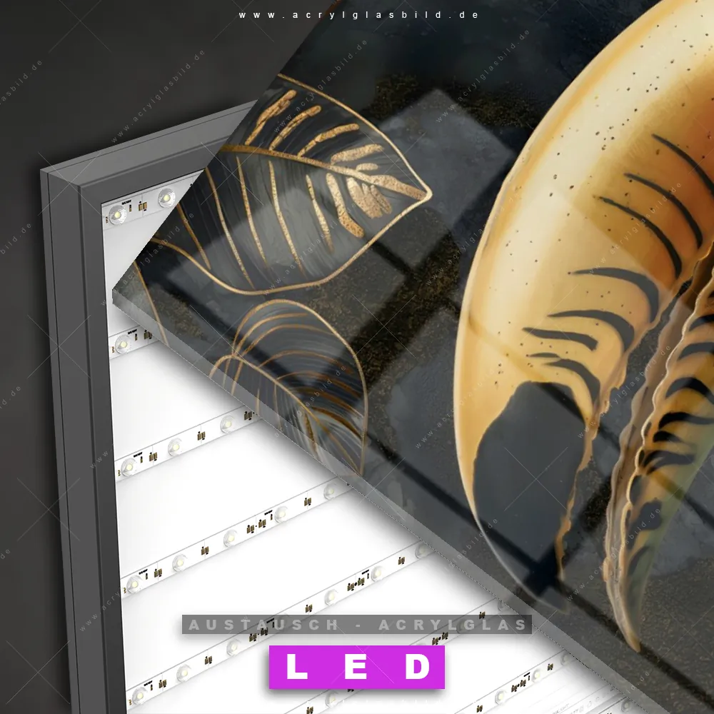 Begriffe wie Tierporträt, Tier, Vogel, Tukan, Dschungel, Blätter, Palmenblätter haben dich auf der Suche nach deinem neuen Austausch-Acrylglasbild inspiriert? Dann sollte das Wechsel-Acrylglasbild Tropischer Vogel in Gold für dein bereits vorhandenes LED Acrylglasbild Canvalight® DIA den Weg zu dir finden.
