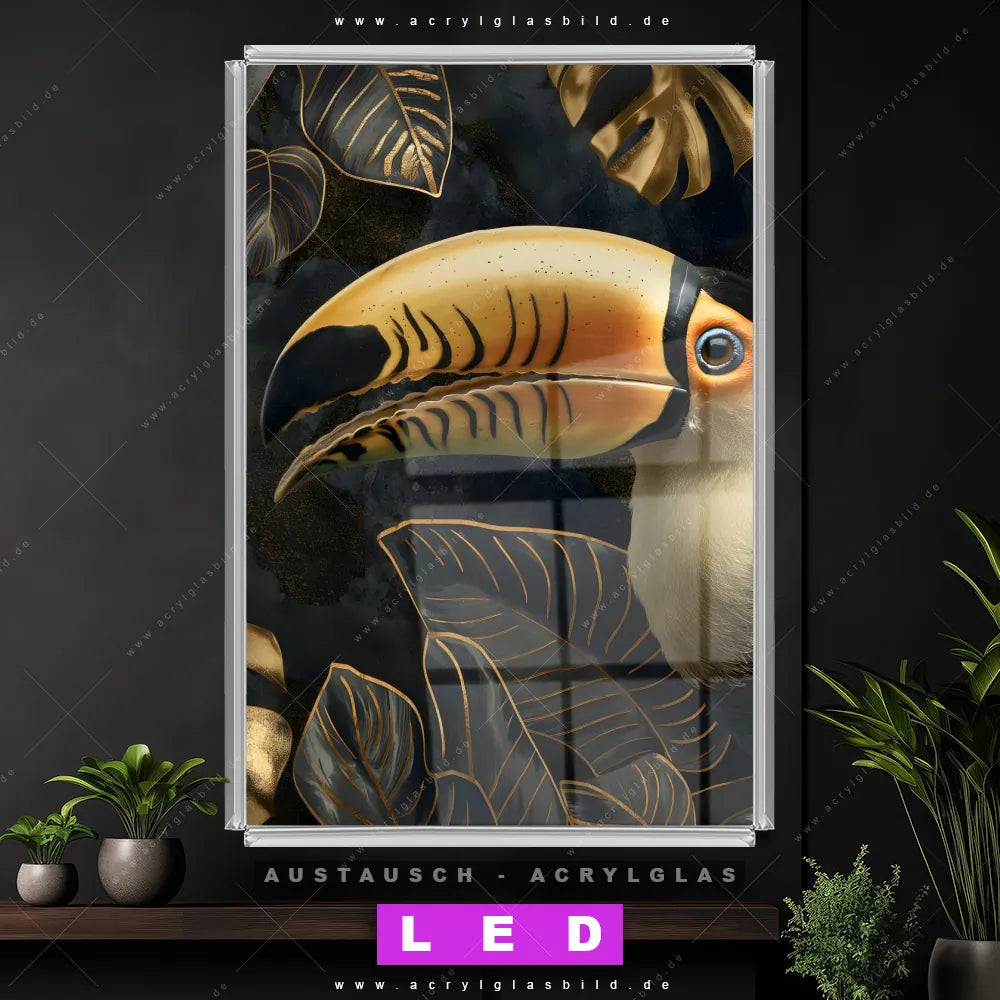 Wechsel-Acrylglas Canvalight® DIA | Monstera und Tukan Gold | Hochformat