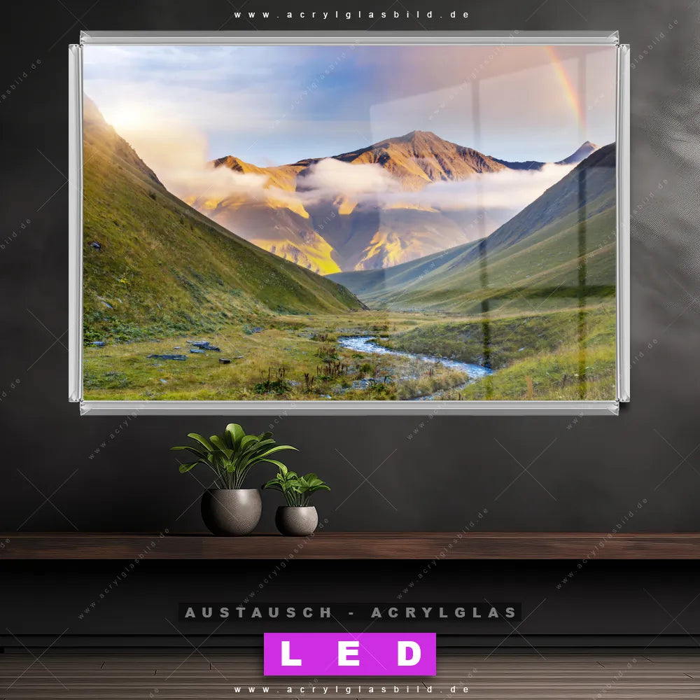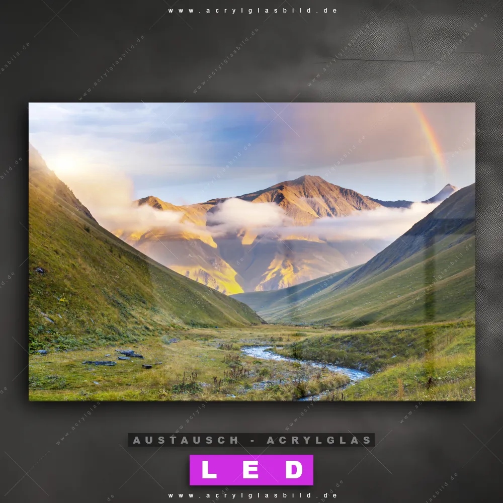 Begriffe wie Berge, Gebirge, Regenbogen, Nebel, Landschaft haben dich auf der Suche nach deinem neuen Austausch-Acrylglasbild inspiriert? Dann sollte das Wechsel-Acrylglasbild Regenbogen in den Bergen für dein bereits vorhandenes LED Acrylglasbild Canvalight® DIA den Weg zu dir finden.