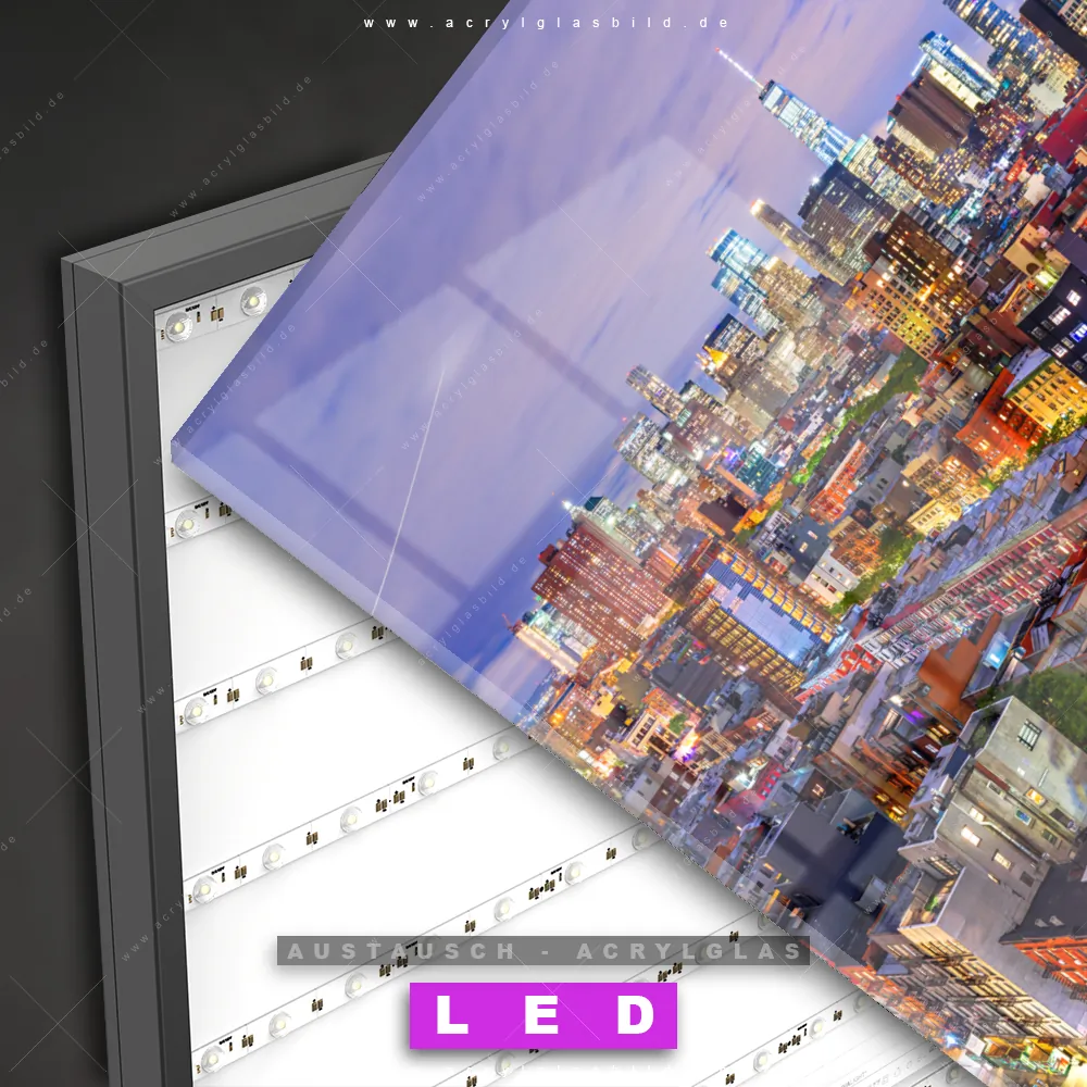 Begriffe wie Skyline, Amerika, New York, Abendhimmel, Stadtpanorama, Metropole, Nachtlichter haben dich auf der Suche nach deinem neuen Austausch-Acrylglasbild inspiriert? Dann sollte das Wechsel-Acrylglasbild Dämmerung über dem Großstadt-Dschungel für dein bereits vorhandenes LED Acrylglasbild Canvalight® DIA den Weg zu dir finden.