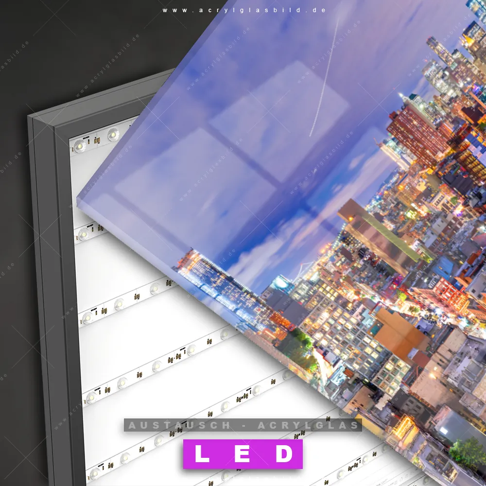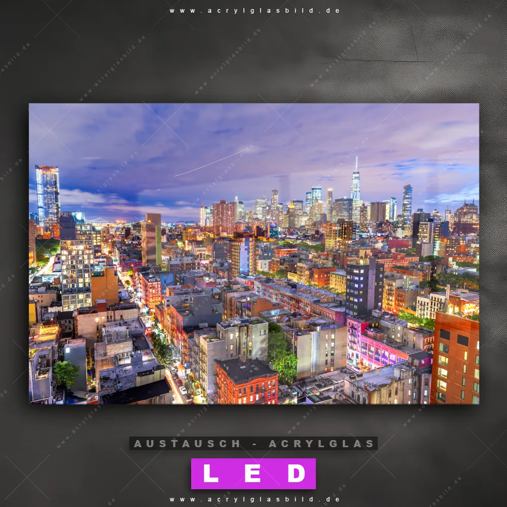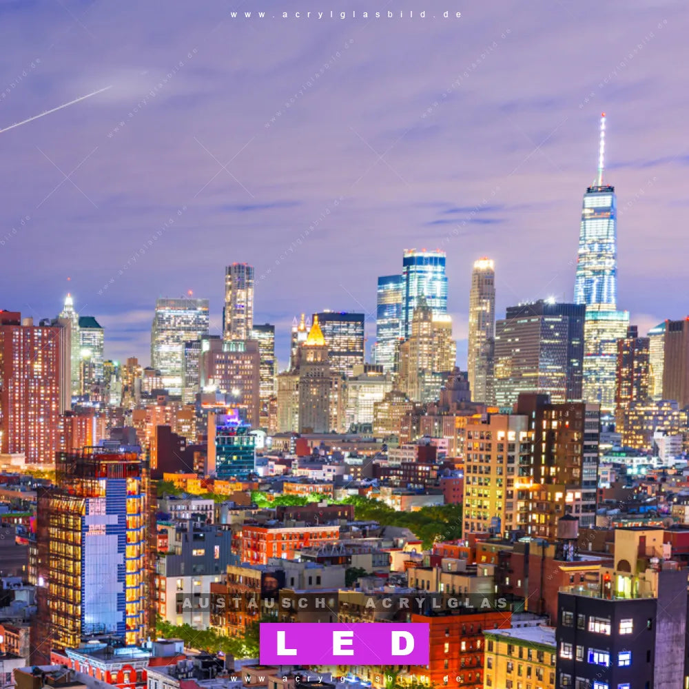 Begriffe wie Skyline, Amerika, New York, Abendhimmel, Stadtpanorama, Metropole, Nachtlichter haben dich auf der Suche nach deinem neuen Austausch-Acrylglasbild inspiriert? Dann sollte das Wechsel-Acrylglasbild Dämmerung über dem Großstadt-Dschungel für dein bereits vorhandenes LED Acrylglasbild Canvalight® DIA den Weg zu dir finden.