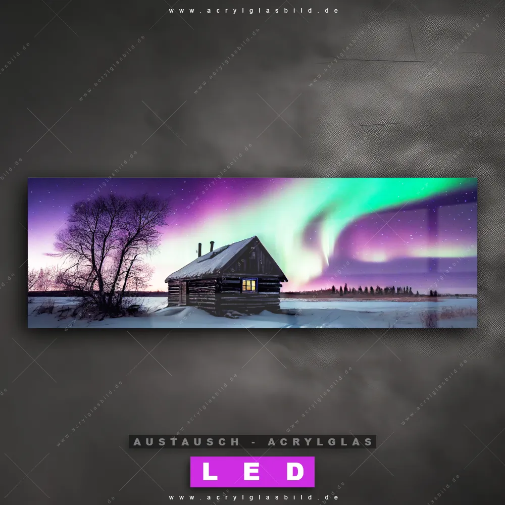 Wechsel-Acrylglas Canvalight® DIA | Nordlichter über einem Holzhaus | Panorama