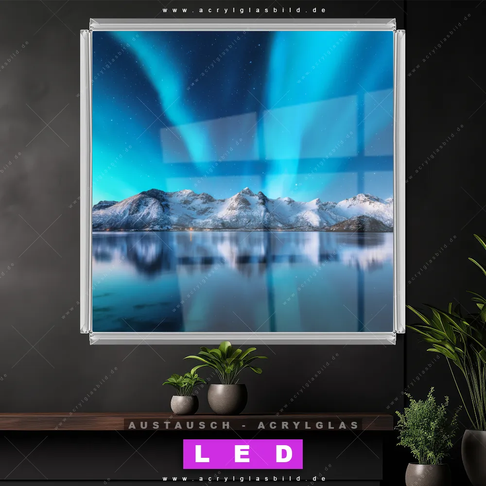 Wechsel-Acrylglas Canvalight® DIA | Nordlichter und schneebedeckte Berge | Quadrat
