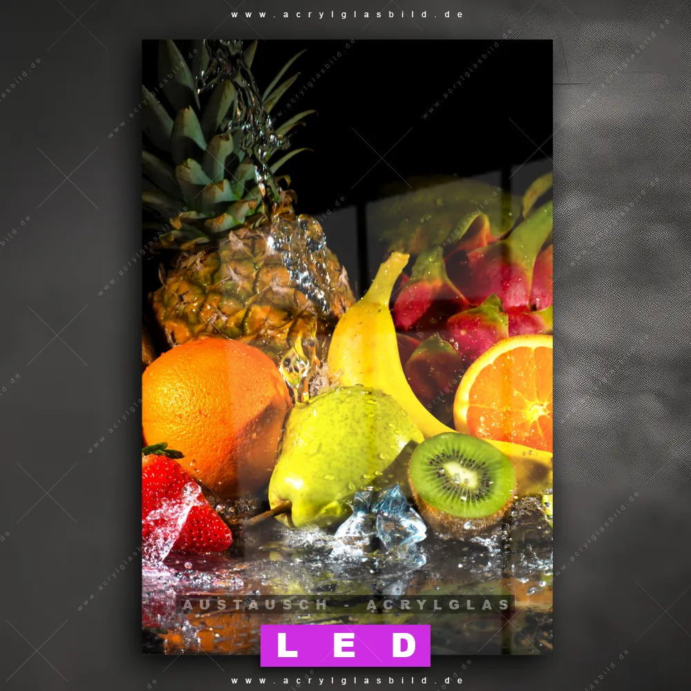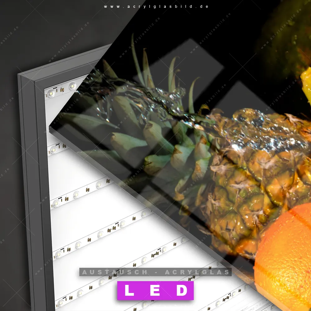 Begriffe wie Obst, Zitrusfrüchte, Früchte, Kiwi, frisch, spritzig, Ananas, Spritzwasser, Wasser, Spritzer, Tropfen, Wassertropfen, Orange, Apfel, Zitrone, Birne, Banane haben dich auf der Suche nach deinem neuen Austausch-Acrylglasbild inspiriert? Dann sollte das Wechsel-Acrylglasbild frische Früchte mit Wasser für dein bereits vorhandenes LED Acrylglasbild Canvalight® DIA den Weg zu dir finden.