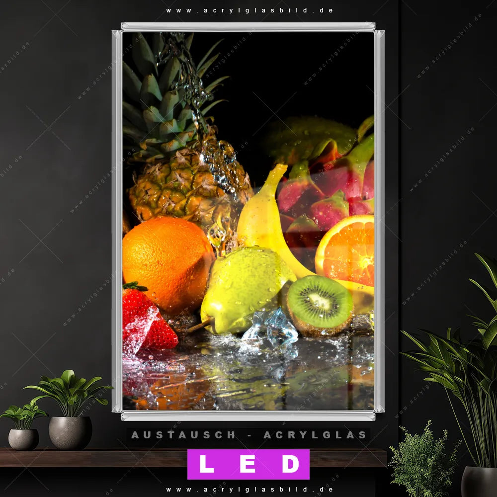 Wechsel-Acrylglas Canvalight® DIA | Obst-in spritzendem Wasser | Hochformat