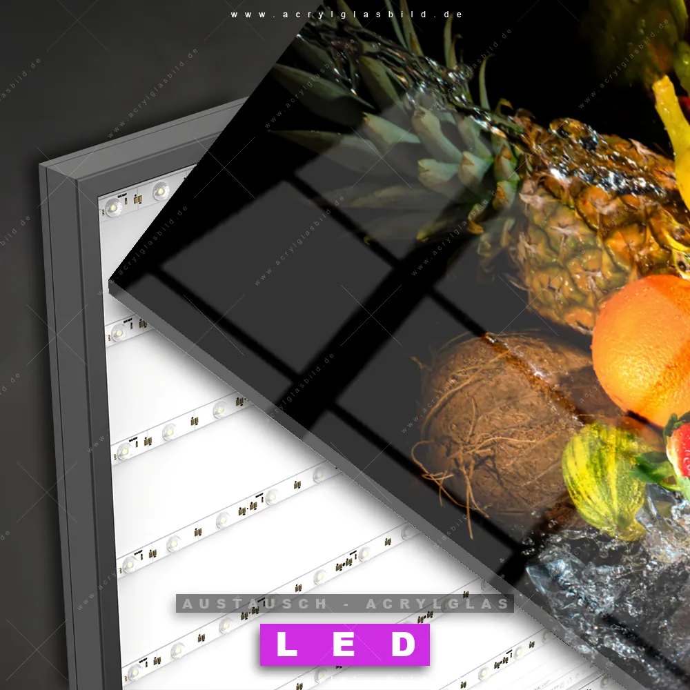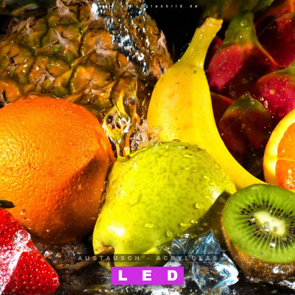 Begriffe wie Obst, Zitrusfrüchte, Früchte, Kiwi, frisch, spritzig, Ananas, Spritzwasser, Wasser, Spritzer, Tropfen, Wassertropfen, Orange, Apfel, Zitrone, Birne, Banane haben dich auf der Suche nach deinem neuen Austausch-Acrylglasbild inspiriert? Dann sollte das Wechsel-Acrylglasbild frische Früchte mit Wasser für dein bereits vorhandenes LED Acrylglasbild Canvalight® DIA den Weg zu dir finden.