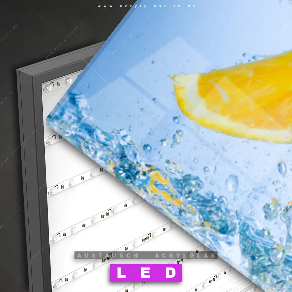 Begriffe wie Obst, Zitrusfrüchte, Früchte, frisch, spritzig, Spritzwasser, Wasser, Spritzer, Tropfen, Wassertropfen, Orange, Zitrone, Limette haben dich auf der Suche nach deinem neuen Austausch-Acrylglasbild inspiriert? Dann sollte das Wechsel-Acrylglasbild Zitrusfrüchte im Wasser für dein bereits vorhandenes LED Acrylglasbild Canvalight® DIA den Weg zu dir finden.