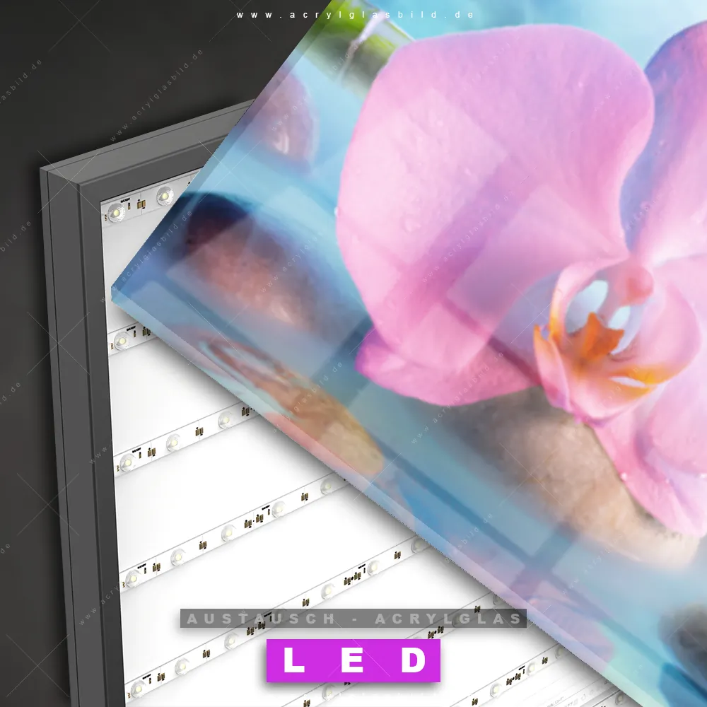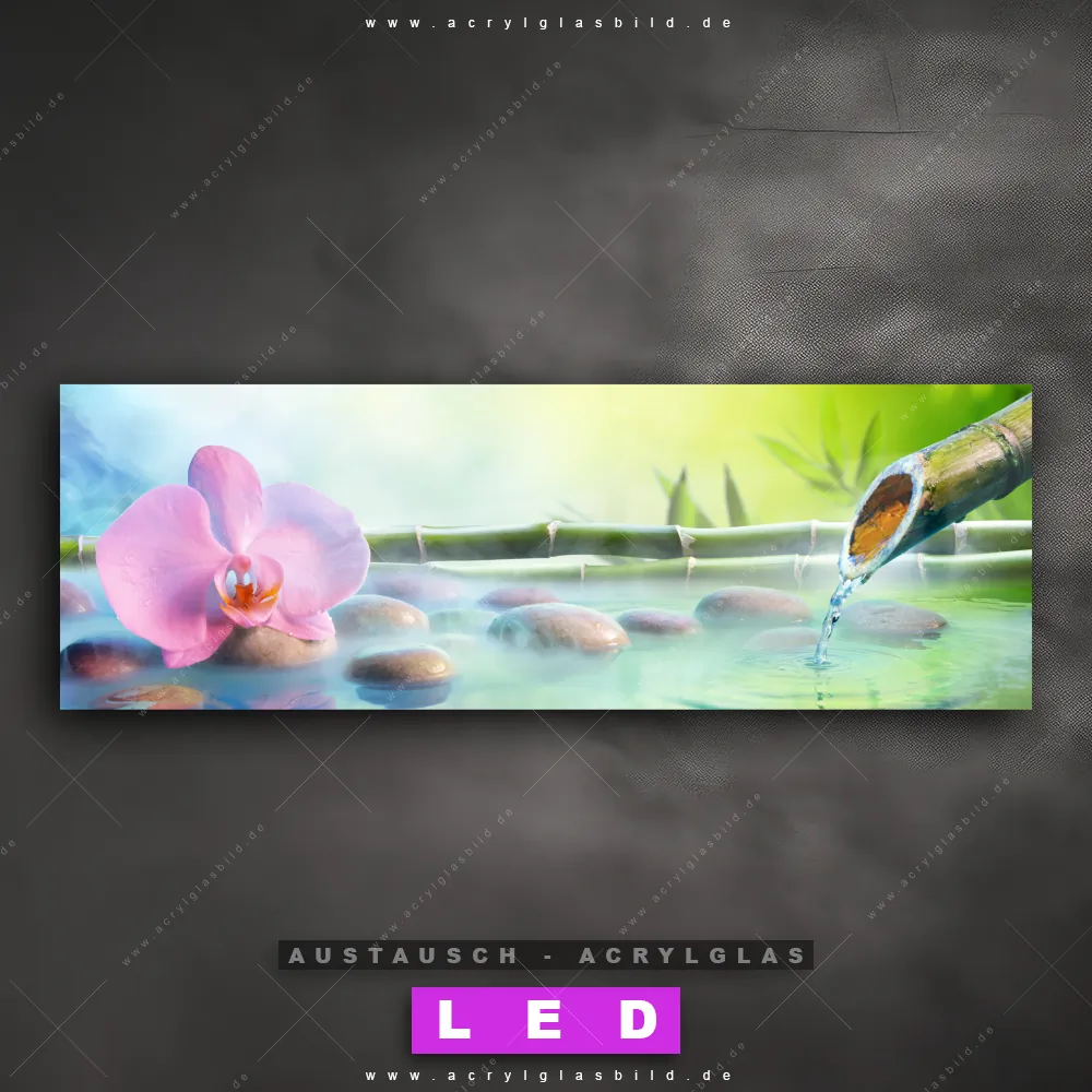 Begriffe wie Buddhismus, Religion, Feng Shui, Zen, Meditation, Bambus, Zengarten, Steine, Zensteine, Blumen, Blüte, Brunnen, Wasser, Orchidee haben dich auf der Suche nach deinem neuen Austausch-Acrylglasbild inspiriert? Dann sollte das Wechsel-Acrylglasbild Orchideenblüte mit Zen-Steinen und Bambus für dein bereits vorhandenes LED Acrylglasbild Canvalight® DIA den Weg zu dir finden.