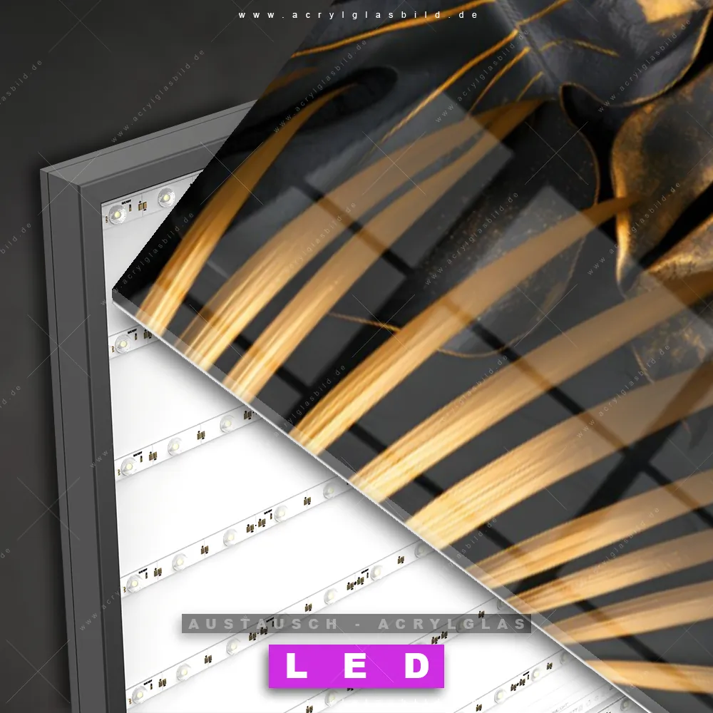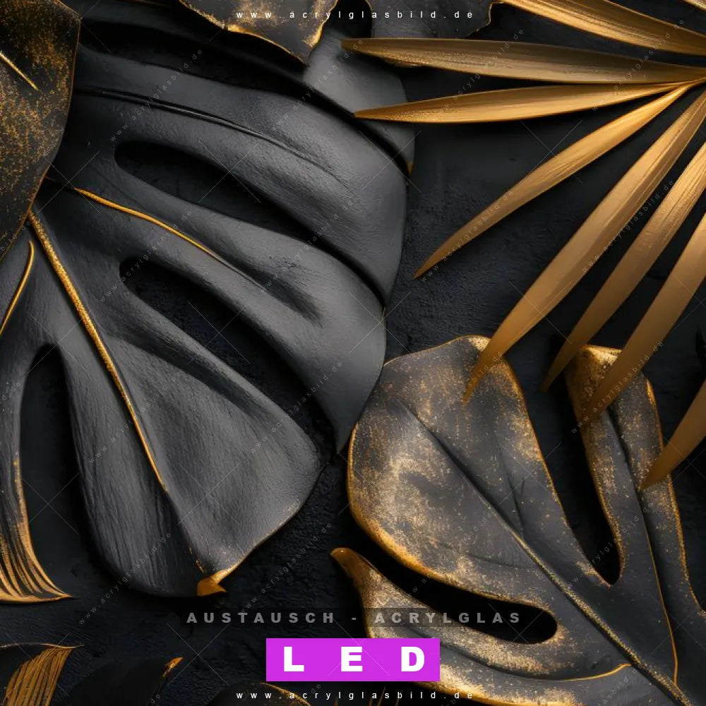 Begriffe wie Blätter, Pflanze, Natur, Nahaufnahme, Laub, Dschungel, Monstera, Palmenblätter haben dich auf der Suche nach deinem neuen Austausch-Acrylglasbild inspiriert? Dann sollte das Wechsel-Acrylglasbild Goldene Tropen-Eleganz für dein bereits vorhandenes LED Acrylglasbild Canvalight® DIA den Weg zu dir finden.