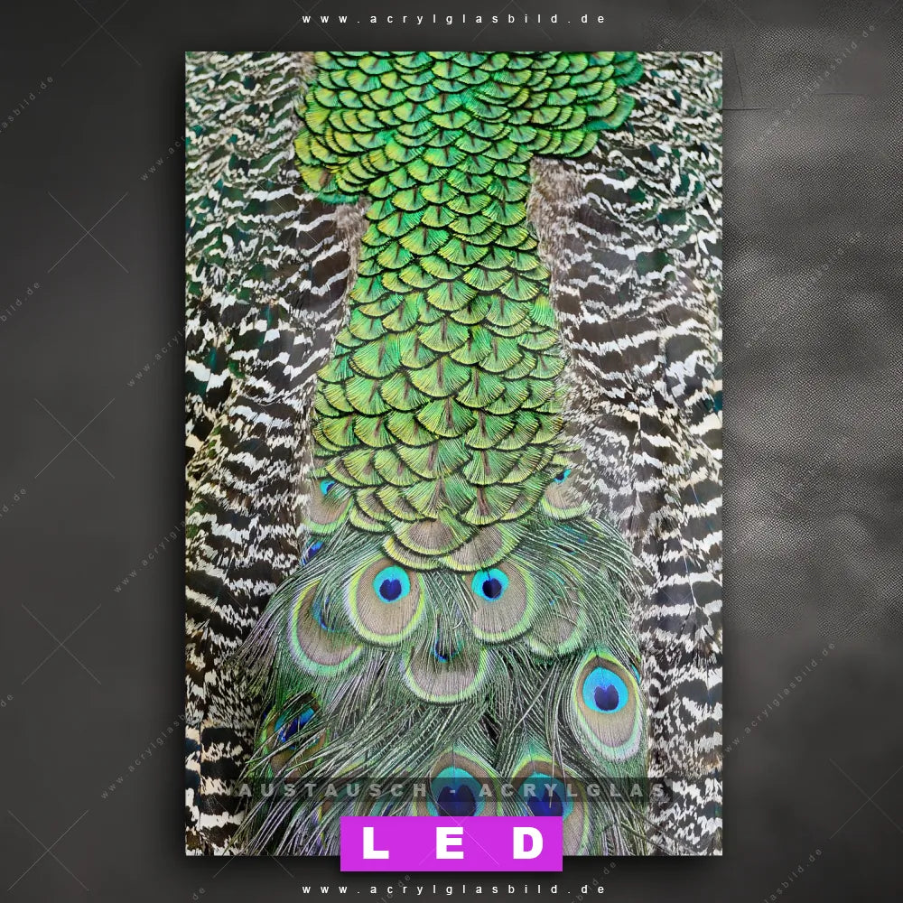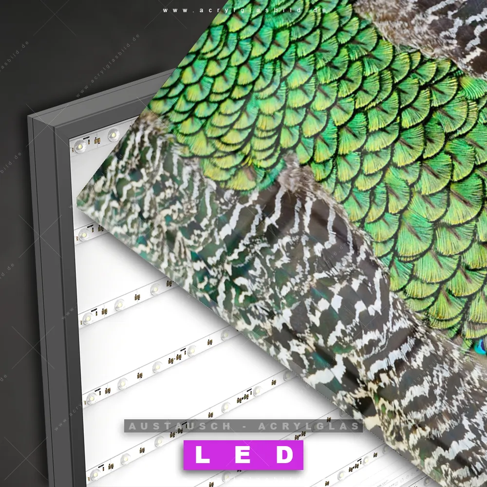 Begriffe wie Vogel, Pfau, Dschungel, Federn, Pfaufedern haben dich auf der Suche nach deinem neuen Austausch-Acrylglasbild inspiriert? Dann sollte das Wechsel-Acrylglasbild Gefieder eines Pfaus für dein bereits vorhandenes LED Acrylglasbild Canvalight® DIA den Weg zu dir finden.