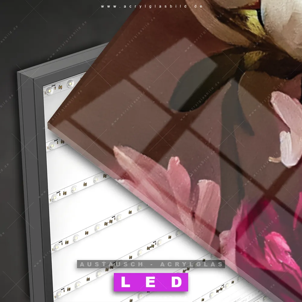 Begriffe wie Pflanze, Natur, Blüte, Nahaufnahme, Blumen, Rosen, Blüten, Malerei, Ölgemälde, Blumenstrauß, Bouquet haben dich auf der Suche nach deinem neuen Austausch-Acrylglasbild inspiriert? Dann sollte das Wechsel-Acrylglasbild Blühende Pfingstrosen mit rosafarbenen Blüten für dein bereits vorhandenes LED Acrylglasbild Canvalight® DIA den Weg zu dir finden.