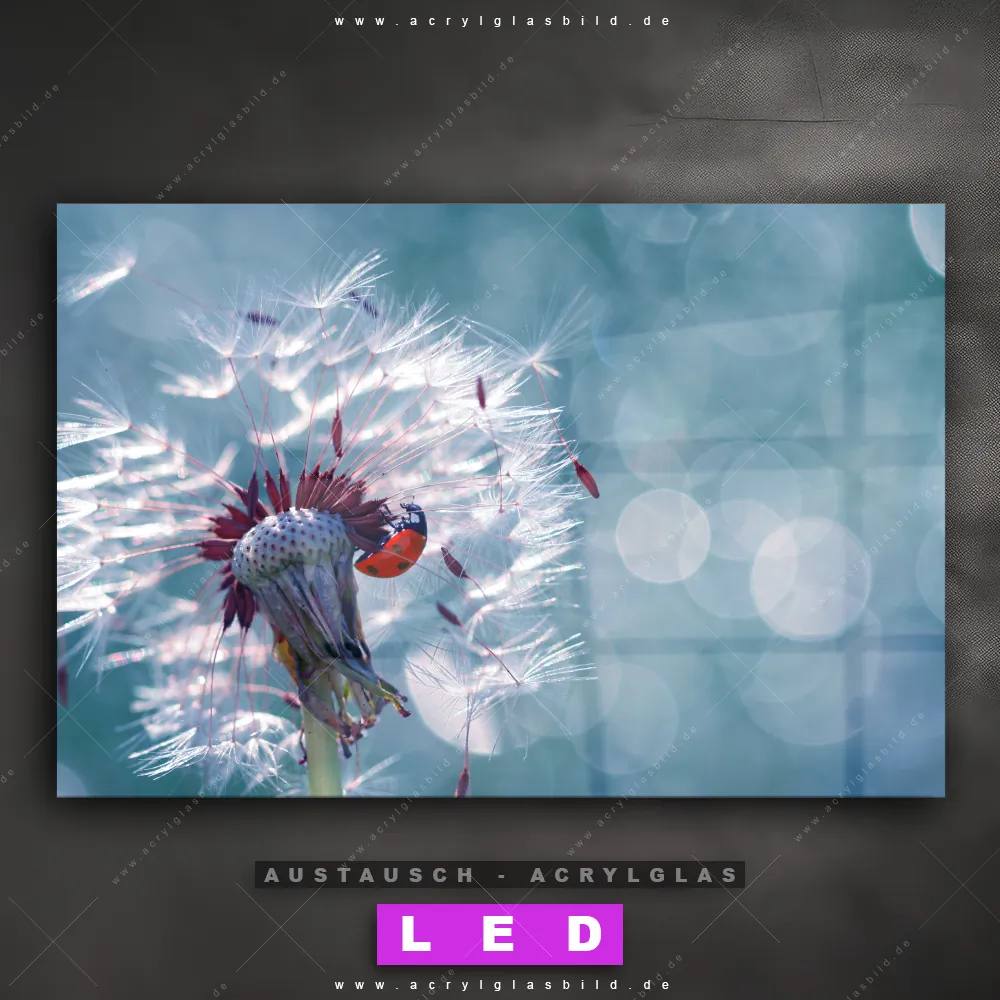 Begriffe wie Blume, Botanik, Pflanze, Natur, Nahaufnahme, Pusteblume, Dandelion, Löwenzahn, Käfer, Marienkäfer, Tier haben dich auf der Suche nach deinem neuen Austausch-Acrylglasbild inspiriert? Dann sollte das Wechsel-Acrylglasbild Kleiner roter Marienkäfer auf Pusteblume für dein bereits vorhandenes LED Acrylglasbild Canvalight® DIA den Weg zu dir finden.
