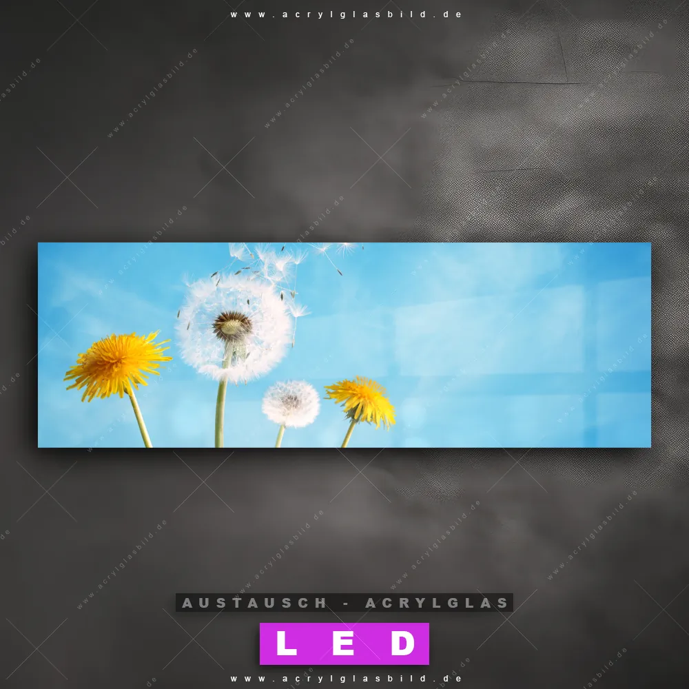 Begriffe wie Blume, Botanik, Pflanze, Natur, Nahaufnahme, Pusteblume, Dandelion, Löwenzahn haben dich auf der Suche nach deinem neuen Austausch-Acrylglasbild inspiriert? Dann sollte das Wechsel-Acrylglasbild Pusteblume und gelbe Löwenzahnblüte für dein bereits vorhandenes LED Acrylglasbild Canvalight® DIA den Weg zu dir finden.