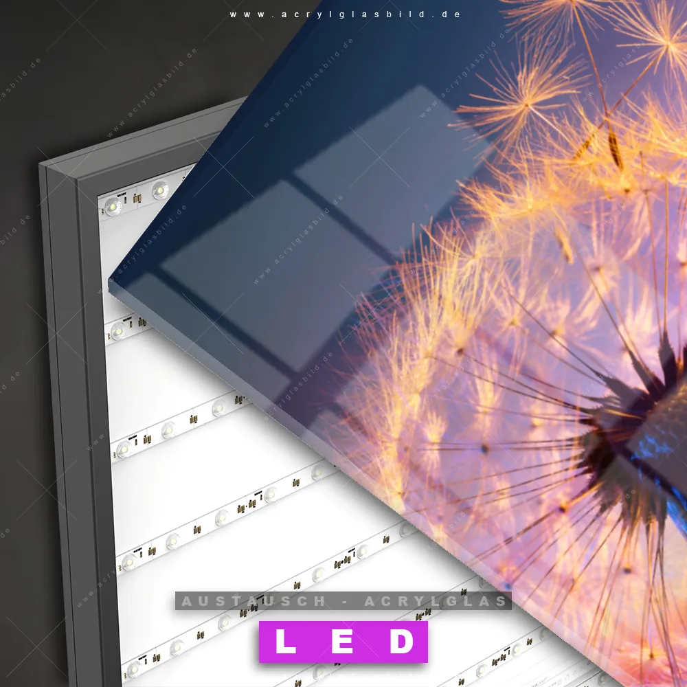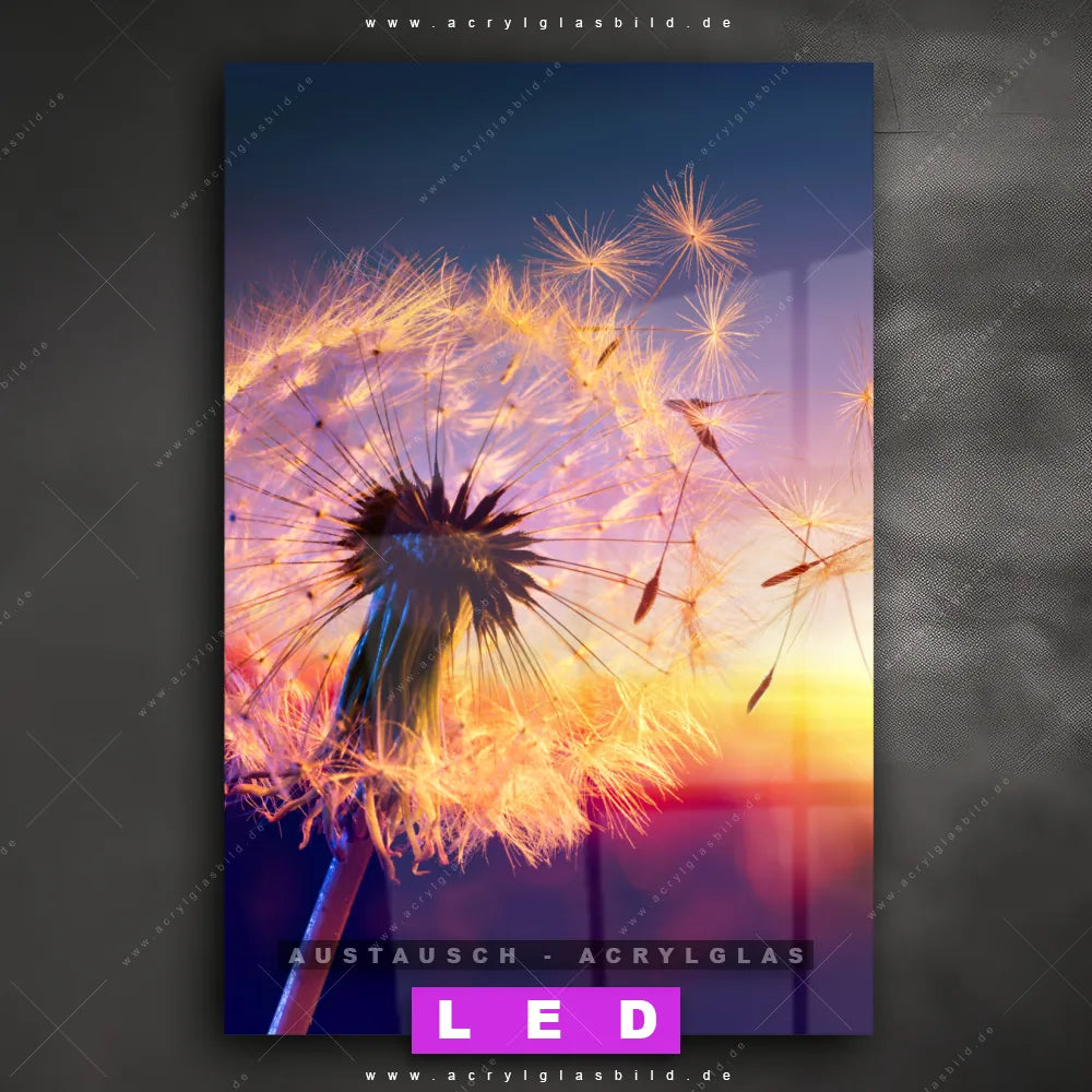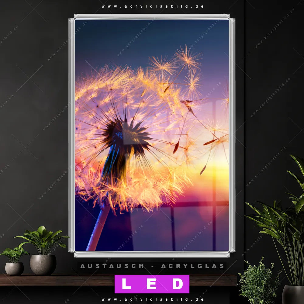 Begriffe wie Blume, Botanik, Pflanze, Natur, Nahaufnahme, Pusteblume, Dandelion, Löwenzahn haben dich auf der Suche nach deinem neuen Austausch-Acrylglasbild inspiriert? Dann sollte das Wechsel-Acrylglasbild Pusteblume mit Sonnenuntergang für dein bereits vorhandenes LED Acrylglasbild Canvalight® DIA den Weg zu dir finden.