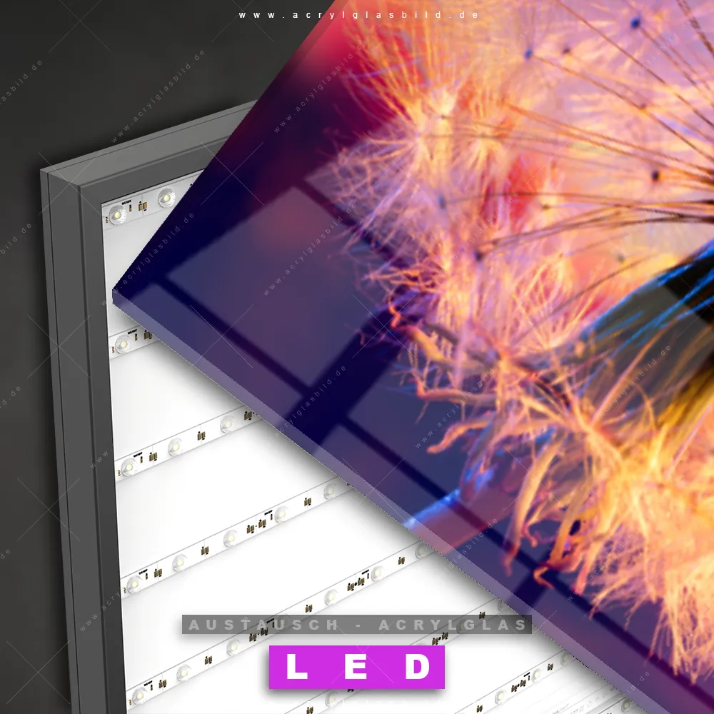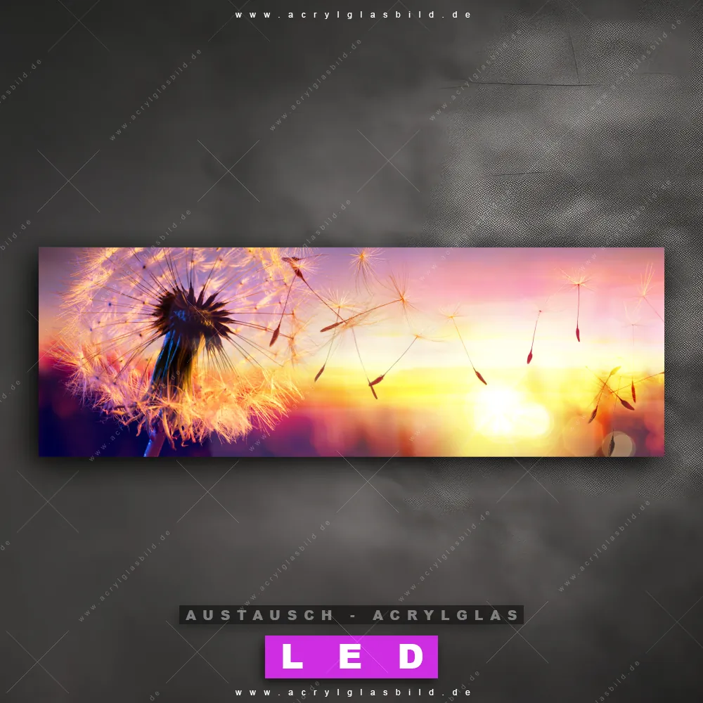 Begriffe wie Blume, Botanik, Pflanze, Natur, Nahaufnahme, Pusteblume, Dandelion, Löwenzahn haben dich auf der Suche nach deinem neuen Austausch-Acrylglasbild inspiriert? Dann sollte das Wechsel-Acrylglasbild Pusteblume mit Sonnenuntergang für dein bereits vorhandenes LED Acrylglasbild Canvalight® DIA den Weg zu dir finden.